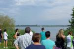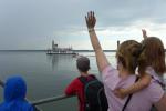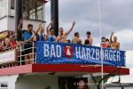 In der langen Warteschlange zur Abholung der Startunterlagen ging der Blick oft nach oben. Dicke Regenwolken thronten am Himmel und entleerten sich immer wieder in kleinen Huschen über den Arendsee. Die Teilnehmer der olympischen Distanz hatten den Kampf mit den Elementen aus dem Vorjahr noch gut in Erinnerung. Haarscharf entkamen sie damals dem tobenden See, was für einige bereits nach der Schwimmdistanz das unwiderrufliche Aus bedeutete. So bestand der Veranstalter in diesem Jahr auch wieder auf die Badekappenpflicht. Nur mit diesem auffallenden Utensil ausgestattet, war der Zutritt zum Schaufelraddampfer „Queen Arendsee“ freigegeben. Promi Antje Buschschulte begleitete als Zuschauerin und zum Daumen drücken ihren Ehemann Helge Meeuw auf der „Queen“. Während der Fahrt zum Start, lauschten die Teilnehmer angespannt den letzten Hinweisen der Wettkampfleitung. Dann ging alles ganz schnell.