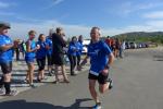 Vom Aussichtsturm „Leonhardt“ gingen jeweils zehn Starter im Minutentakt auf die Reise. Elf Gaensefurther waren auf der Kurzstrecke mit dabei. Da hatten es die Fahrgäste im Geiseltal-Express doch etwas bequemer. Unbeeindruckt und manchmal gefährlich nahe, zog die bunte Kleinwegebahn an den Läufern vorbei. In leichten Wellen ging es auf dem Geiseltalrundweg entlang, bevor die letzten drei Kilometer direkt am See zurückführten. Nach dem großen Zielbogen am Besucherzentrum Marina wurden alle Finisher herzlich begrüßt. Zehn Sekunden schneller als im vorigen Jahr, fuhr Sandra Homann (1. Platz Altersklasse W40) im vereinsinternen Duell den Sieg für sich ein, gefolgt von Jana Berger (1. Platz W50) und Janine Wuwer (3. Platz W35).