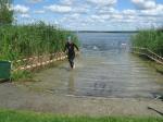 Nachdem der altehrwürdige Schaufelraddampfer "Queen Mary" die 110 Starter, darunter acht Gaensefurther, zum "fliegenden Start" ins Wasser befördert hatte, ging es schnurgerade wieder auf den Strand zu. Erstmals in Arendsee übrigens nicht mit motorisierter Begleitung, da sich einige Athleten in den Vorjahren über die Abgase des Begleitbootes beschwerten. "Vorneweg paddelte diesmal ein Drachenboot. Das war eine schöne Orientierung." Am dichtesten hinter der Zehn-Mann-Besatzung schwamm von den Gaensefurthern Abteilungsleiter Steffen Schöler, der nach 31:09 Minuten die Wechselzone erreichte.