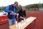 Ein schneller Sprint über fünf Kilometer war zu absolvieren, und mit den langgezogenen Stufen hinauf zum Märchengarten waren die zwei Runden durchaus anspruchsvoll. Nico Mahler, der hier im vorigen Jahr regelrecht den Startschuss verpasst hatte und dem Läuferfeld hinterher jagen musste, war bei dieser Auflage besonders wachsam. Ironisch monierte er einen Tiefstart, womit er die Lacher erstmal auf seiner Seite hatte. Spätestens mit dem Start konzentrierte sich dann jeder Sportler wieder auf seinen Lauf. Nachdem sich das Feld auf dem ersten Kilometer sortiert hatte, folgten auch bald die angekündigten Treppenstufen. Kein Problem für alle gut trainieren Läufer, zumal ganz oben rhythmische Saxophonklänge zum Durchhalten animierten. Die Bedingungen waren gut, und nach einer geraden Passage ging es wieder hinab in Richtung Bernburger Arena. Mit der Motivation der Zuschauer folgte auch schon die zweite Runde. Alle Männer liefen im vorderen Feld mit, auch Kathleen schlug sich wacker und war bald nicht mehr zu sehen. Renate nahm Stufe für Stufe nach der Taktangabe von Sabine Börner: "Hopp, hopp, hopp!" Oben angekommen, servierte Katrin Winkler-Hindricks wieder neue Rhythmen aus dem Saxophon, mit denen Börner ihrem Schützling die Sporen gab: "Lauf Renate, du kommst alleine klar!" Susan Dannehl, die gehend nach Luft schnappte, brauchte da eher einen Motivator. Sie war zum ersten Mal bei einem Wettkampf gestartet und in ihrem Leben schon lange keine fünf Kilometer mehr durchgelaufen. Eine Gehpause mit tiefen Atemzügen war hier erstmal das allerbeste. "Die Hälfte hätte auch gereicht!", gesteht sich die Debütantin und zweifelt kopfschüttelnd darüber, wie man nur einen ganzen Marathon durchhalten kann. Da plauderte Börner natürlich gerne aus dem Nähkästchen, denn nicht viel anders sahen ihre ersten Laufversuche damals aus. Im leichten Trab war die Anhöhe erreicht und locker ging es wieder hinab, total egal ob Schlusslicht oder nicht. Die kleine Parkeisenbahn zuckelte genauso gemütlich wie das Duo vorbei und nach den letzten Stadionmetern galt der Applaus einer wahnsinnig glücklichen Läuferin: "Susan, du hast heute alle geschlagen, die auf der Couch liegen geblieben sind!"