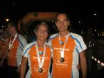 Und der Magdeburger SportSchecklauf war wirklich ein großes Event. Die Aufregung, aber auch die Freude, dass es nun endlich los gehen kann, konnte Claudia nicht verbergen. Verstärkt wurde die Anspannung nicht nur durch die 16 mitgereisten Lauffreunde, sondern auch durch die übrigen rund 3.000 Läufer, welche sich in orangenen Laufshirts bis kurz vor dem Start unter die bummelnden Freitagabend-Einkäufer mischten. Magdeburgs City war abgesperrt, die Läufer über die Fünf-Kilometerdistanz standen hinter dem Startbogen und Claudia Meier stand mittendrin. Nach Gruppenfoto und den üblichen guten Wünschen für den Lauf, hatte sich die Truppe im hinteren Feld einsortiert. Man wollte versuchen zusammen zu laufen, soweit das bei den Massen überhaupt möglich sein sollte. Fast zwei Minuten vergingen nach dem Startschuss, bis alle Bode-Runners die Startlinie überquert hatten. Nun lief auch Claudias Zeit. Über die breite Strombrücke verteilte sich das Läuferfeld recht zügig und erste weite Ausblicke auf die bunt beleuchtete Magdeburger Elb-Kulisse sorgten für Gänsehaut. Während Lauffreunde Anfangs mit gutgemeinten Sprüchen die Situation entspannen wollten, beruhigte Dirk mit Blick auf die Stoppuhr: „Genau dein Tempo!“ Aufgereihte Fackeln beleuchteten das dunkle Elbufer. Beeindruckt schob sich das Läuferfeld durch die Nacht, inzwischen war es 21.00 Uhr. Von weitem vernahm man bereits Trommler, welche die Läufer am Ende der Sternbrücke im Takt begleiteten. Durch die neu gestalteten Elbterrassen verschwanden die Sportler dann teilweise im Schatten des gigantischen Domgemäuers. Vorbei am Hundertwasserhaus war bereits der Startbogen zu erkennen. Während man im großen Feld die Lauffreunde für den Zieleinlauf ortete, kam das Gefühl, ´Schade, schon vorbei´. Claudia gab alles und auf den letzten 100 Metern sogar einen Sprint. So einige Bode-Runners hatten Mühe ihr zu folgen. Ja, auch das hatten sie trainiert! „Ach, hätten ruhig sechs Kilometer sein können!“, grinste sie bis an die Ohren und stellte sich mit Dirk noch einmal den Fotografen. Ausbaufähig, waren sich alle Bode-Runners der Gaensefurther Sportbewegung einig! Claudi, wir bräuchten da noch einen Staffelläufer für den Frankfurt Marathon…