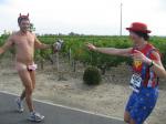 Neun Bode-Runners der Gaensefurther Sportbewegung gehörten zu den glücklichen Teilnehmern am Marathon des Chateaux du Medoc. Zusammen mit Sportlern aus Halberstadt, Aschersleben, Bernburg und Frankfurt bezog man im Feriendorf Lacanau an der südfranzösischen Atlantikküste Quartier. Ein sonnenverwöhntes Paradies unweit der Chateaus, welche sich durch die edelsten Weine dieser Erde ihren Namen machten. Erwartungsvoll begab sich die Gruppe in das Meer der knapp 9.000 Läufer und nach einem fast zwei stündigen Showprogramm, ging es dann wirklich auf die 42,195 Kilometer lange Weinverkostung. Der erste WC-Stopp erfolgte bereits vor dem ersten Kilometerschild, denn der eigene, gut gefüllte Getränkevorrat machte sich nach dem langen Stehen in morgendlicher Kälte bemerkbar. Kein leichtes Unterfangen, hatte man doch die ursprüngliche Laufbekleidung gegen ein Clown-Kostüm eingetauscht. Nachdem alle Hosenträger und Sicherheitsnadeln wieder an der richtigen Stelle waren und man inzwischen von schätzungsweise 4.000 Läufer überholt wurde, verließ die Gruppe unter dem Beifall zahlreicher Schaulustiger Pauillac. Eine Runde um die ersten Chateaus war zu absolvieren, bevor man nach 22 Kilometern den Ort wieder erreichen wollte. Ziel war, diese Strecke ziemlich zügig zu laufen, dann bei Kilometer 22 Renate Liedtke mitzunehmen und den Rest des Marathons gemeinsam zu genießen. Einen ersten erlesenen Tropfen Beychevelle gab es bereits bei Kilometer sieben. À la vôtre! Läufer aus der ganzen Welt prosteten sich genüsslich zu, die Bode-Runners vor jedem Schloss im Fotoshooting. Alle Verpflegungsstände waren üppig gedeckt. Neben frischem Obst reichte man den Läufern Salzgebäck, verschiedene Brot- und Käsesorten, Kuchen und Kekse, Trockenfrüchte, Wasser, Cola und natürlich immer wieder ein Becherchen Rotwein. Nach gut 2,5 Stunden erreichte man wieder Pauillac und Renate übernahm die Tempoarbeit. Mit den Chateaus Mouton und Lafite Rothschild nährte sich die Gruppe einem weiteren Höhepunkt. In der Parkanlage am prunkvollen Schloss, kredenzte man die edlen Tropfen natürlich in Gläsern. Eine logistische Meisterleitung für über 8.000 Läufer! Bereits mächtig dem Alkohol verfallen, ließen es sich einige Läufer nicht nehmen, im Teich der Rothschilds ein ernüchterndes Bad zu nehmen. Außer der zunehmend schwerer werdenden Beine verkrafteten die Staßfurter Läufer die ungewohnte Herausforderung bislang ohne Verluste. Eine Zielzeit von 6:30 Stunden war vom Veranstalter als Zeitlimit vorgegeben, dass müsste doch zu schaffen sein! Inzwischen war Kilometer 36 passiert, die Anstiege zu den höher gelegenen Chateaus lagen hinter den Läufern und es ging hinaus auf die Küstenstraße. Vor einem kleinen Imbisswagen drängte sich die Läuferscharr. Vom dicken Bayonner Schinken schnitt ein waschechter Franzose dünne Scheiben, die fluchs geschnappt, durch die Masse gereicht wurden. Ein leicht salziger Gaumenschmaus für den sich die kleine Pause gelohnt hatte! Nicht weit entfernt roch man bereits das nächste Highlight. Auf großen Tabletts wurden Austern mit Zitronen gereicht. Dazu servierte man den Läufern einen trockenen Weißwein. Für alle Bode-Runners eine Mutprobe die bereits im Vorfeld im Pflichtenheft aufgenommen wurde. Und eine Erfahrung, welche die meisten nicht noch einmal haben müssen. Da zog der Duft von frisch gegrilltem Rindersteak die Läufer schon eher zum nächsten Anlaufpunkt. Wer noch nicht genug hatte, konnte sich dazu auch einen feinen Cognac einschenken lassen. Nach diesen Schlemmermeilen und der brütenden Sonne sehnte man sich nach dem Ende. Nun kam auch noch ein Franzose mit einem riesigen Spiegel auf die Mädels zu. Danke, wir wissen wie es um uns gestellt ist, versuchte man zu übermitteln. Aber höflich lud er an den Straßenrand zur Auffrischung der Schminke ein, schließlich sollte beim Zieleinlauf alles perfekt sein. Nun hatte man also auch noch die Deutschlandfarben auf der Wange und nachdem alle noch ein Stieleis naschten, kamen auch die Kräfte wieder zurück. Ein Blick auf die Stoppuhr: „Das schaffen wir noch unter sechs Stunden!“ Gemeinsam genoss man nach 5:58 Stunden das Überqueren der Ziellinie, über 3.000 Läufer sollten noch folgen. Nicht umsonst spricht man vom „längsten Marathon der Welt“.