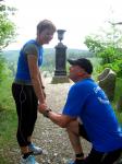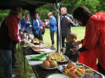 Nach verschlungenen Waldwegen passierten die 16-Kilometer-Läufer die sagenumwobene Mägdetrappe und es ging rasant bergab in Richtung Mägdesprung. Bei Sabine Börner sorgte das lose Felsgestein für einen unfreiwilligen Stopp. Zum Glück waren alle Glieder ordentlich warmgelaufen und der Abstieg konnte fortgesetzt werden. In Mägdesprung angekommen, ging es wieder 120 Höhenmeter hinauf. Geteiltes Leid ist halbes Leid dachte sich das Trio Sylvia Köhn, Lutz Klauß und Jens-Uwe Börner. Gemeinsam spornten sie sich an, machten sich Mut und kamen bald darauf über einen schmalen Klippenweg am sogenannten „Pioniertunnel“ an. Die Durchquerung des 15 Meter langen Felsdurchbruchs war nur in gebückter Haltung möglich, ein Fotomotiv wie für Börner gemacht! Am Verpflegungsstand konnten sich die Läufer noch einmal stärken, denn nun kam der Anstieg zum Birkenhäuschen. Hinab ins Steintälchen ging es wieder hinauf zum Himmelsgarten bevor die Strecke auf den letzten drei Kilometern herrlich sanft auslief. Im Zielbereich herzlich vom Publikum und Moderator empfangen, kümmerte sich ein Sportfreund „Peter“ rührend um alle einlaufenden Damenbeine. Er ließ es sich nicht nehmen, den Transponder für die Zeitmessung höchstpersönlich zu entfernen. Bis zum Zielschluss hatte sich der Regen zurückgehalten, bei der Siegerehrung schüttete es dann aber ordentlich. Aus dem schützenden Zelt, hinauf aufs Treppchen, durften wieder nur die Bode-Runner-Damen. Ina Schöler von der ZLG Atzendorf wurde ziemlich nass, denn nicht nur die Gesamtzweite bei den Damen, sondern auch der Sieg in ihrer Altersklasse verlangte nach ihrem Erscheinen. Isa Höber siegte souverän in der W 45 und Sylvia Köhn und Sabine Börner freuten sich über einen zweiten Platz in den Altersklassen W 30 und W 45.