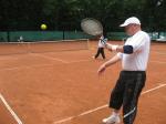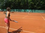 Hoch interessiert und motiviert fanden sich also Läufer und Triathleten auf den vier neu rekonstruierten Tennisplätzen ein. Vorerst bestaunte man die ebenfalls frisch sanierten Vereinsräume, waren doch die Plätze aufgrund heftiger Regenfälle noch mit großen Pfützen gespickt. Fleißige Tennisspieler waren aber bereits dabei, mit Riesenbesen die Plätze wieder bespielbar zu machen. Die Grills arbeiten dann auch bald auf Hochtouren und die Bierchen und lecker mitgebrachten Salate stimmten wohl sogar den Wettergott gnädig. Unter kompetenten Anleitungen wurde nun dem einen oder anderen Runner wohl zum ersten Mal Vor- und Rückhand erklärt. Nach ersten Aufschlagübungen und nahen Netzschlägen der Anfänger, lieferten sich Alleskönner und Profils bereits ordentliche Schmetterbälle, gekonnte Passierschläge oder Stoppbälle. Bis zum Abend hielt das rege Treiben auf den Plätzen an.