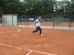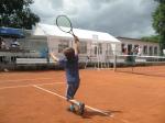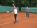 Hoch interessiert und motiviert fanden sich also Läufer und Triathleten auf den vier neu rekonstruierten Tennisplätzen ein. Vorerst bestaunte man die ebenfalls frisch sanierten Vereinsräume, waren doch die Plätze aufgrund heftiger Regenfälle noch mit großen Pfützen gespickt. Fleißige Tennisspieler waren aber bereits dabei, mit Riesenbesen die Plätze wieder bespielbar zu machen. Die Grills arbeiten dann auch bald auf Hochtouren und die Bierchen und lecker mitgebrachten Salate stimmten wohl sogar den Wettergott gnädig. Unter kompetenten Anleitungen wurde nun dem einen oder anderen Runner wohl zum ersten Mal Vor- und Rückhand erklärt. Nach ersten Aufschlagübungen und nahen Netzschlägen der Anfänger, lieferten sich Alleskönner und Profils bereits ordentliche Schmetterbälle, gekonnte Passierschläge oder Stoppbälle. Bis zum Abend hielt das rege Treiben auf den Plätzen an.
