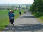 Als anspruchsvoll und für „Fortgeschrittene“ deklariert, sollte die Strecke ihrer Beschreibung durchaus gerecht werden. Bereits nach dem ersten Kilometer stieg die Asphaltstraße merklich an. Doch gerade als das Atmen zu anstrengend werden sollte, sorgte ein schattiger Waldweg wieder für Entspannung. Das Spiel zwischen Licht und Schatten erforderte die ganze Aufmerksamkeit der Läufer. Hatten die Veranstalter den quer liegenden Baum als Extra-Bonbon auf dem Weg drapiert? Wie bei der „stillen Post“ wurde vom Vordermann lauthals an den Verfolger weitergegeben: „Baum!“ Gehüpft, gegrätscht oder draufgetreten, die Barriere sollte für die Läufer kein Hindernis sein. Aus dem Wäldchen führte die Strecke hinaus auf die Felder. Bis zur Streckenteilung brannte die Sonne zusätzlich auf die erhitzten Köpfe. Streckenposten teilten nun die ankommenden Läufer auf: „Die Sieben Kilometer nach links, elf Kilometer nach rechts!“ „Machs gut, arme Bine“, verabschiedete sich Petra Becker von ihrer Vereinskollegin. Zusammen mit Heidi Schwenke vom BSV Eickendorf flitzte Becker nun in Richtung Konradsburg. Die Wahl der kürzeren Streckenlänge sollte sich am Ende gelohnt haben, denn beide Läuferinnen konnten in ihren Altersklassen auf das Siegertreppchen steigen.
