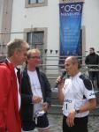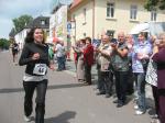 Nienburg feierte in der letzten Woche nicht nur 1050 Jahre Stadtgeschichte, Nienburg blickt auch bereits auf 125 Jahre Sport zurück. Und Bürgermeister Markus Bauer dachte sich für dieses Jubiläum einen ganz besonderen Wettkampf aus. Eingeladen und zum Duell herausgefordert wurde der größte Sohn der Stadt: Marathon-Doppel-Olympiasieger Waldemar Cierpinski. Gerne nahm der sympathische Sportler die Einladung des Bürgermeisters an und lief sich bereits mit den Kleinsten beim Bambinilauf warm. Eine ganze Stadtrunde liefen anschließend die Schüler, während die Jugend bereits drei Runden absolvierte. Vorbei an der Festmeile, hinunter über Kopfsteinpflaster und wieder hinauf durch die kleinen Nienburger Gassen, kamen dann die neun Bode-Runners der Gaensefurther Sportbewegung ganze sieben Mal auf ihre Kosten. Die Stimmung an der Strecke war großartig, Moderator und Publikum heizte den Läufern ordentlich ein. Doch wo war Waldemar? Er wich seinem „Konkurrent“ nicht von der Seite, gab nebenbei hilfreiche Lauftipps und genoss sichtlich das Bad in der Menge. Gewertet wurden bei dieser Premiere nur die ersten drei Einläufe der Männer und Frauen, auch auf eine Zeitmessung wurde verzichtet, denn es stand der Spaß im Vordergrund. Großes Kino abschließend auf der Festbühne, wo die Prominenz die Platzierten mit Medaillen ehrte.