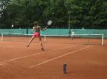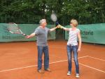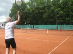 Hoch interessiert und motiviert fanden sich also Läufer und Triathleten auf den vier neu rekonstruierten Tennisplätzen ein. Vorerst bestaunte man die ebenfalls frisch sanierten Vereinsräume, waren doch die Plätze aufgrund heftiger Regenfälle noch mit großen Pfützen gespickt. Fleißige Tennisspieler waren aber bereits dabei, mit Riesenbesen die Plätze wieder bespielbar zu machen. Die Grills arbeiten dann auch bald auf Hochtouren und die Bierchen und lecker mitgebrachten Salate stimmten wohl sogar den Wettergott gnädig. Unter kompetenten Anleitungen wurde nun dem einen oder anderen Runner wohl zum ersten Mal Vor- und Rückhand erklärt. Nach ersten Aufschlagübungen und nahen Netzschlägen der Anfänger, lieferten sich Alleskönner und Profils bereits ordentliche Schmetterbälle, gekonnte Passierschläge oder Stoppbälle. Bis zum Abend hielt das rege Treiben auf den Plätzen an.