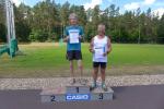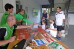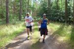 Nun blieb nicht mehr viel Zeit bis zum Start über die Wertungstrecken der sechs und zwölf Kilometer. Nochmal ordentlich mit Wasser benetzt, wollten die Läufer nur noch schnell in den nahen Wald. Doch damit sich der Pulk an Läufern besser auseinander zieht, hatte sich die LG Roland ausgedacht, nach der halben Runde eine weitere im Stadion laufen zu lassen. So eine Stadionrunde ist bekanntlich 400 Meter lang! Bevor sich die Läufer also in den schattigen Wald retten konnten, hatten sie bereits einen Kilometer hinter sich. Auf weichen Waldwegen ging es dann zunächst im Gänsemarsch weiter, bis breitere Wege auch das nebeneinander laufen möglich machten. Noch vor dem Start hatten sich einige Bode-Runners zu Laufpärchen verabredet. Spätestens nachdem der Startschuss gefallen war, waren auch die meisten Absprachen Geschichte, denn beim Wettkampf läuft dann doch meist jeder für sich allein. Nur in der hinteren, ruhigeren Tempogruppe konnten die Kämpfe im Spitzenfeld verfolgt werden, denn nach einer Kehre kamen ihnen die ersten Läufer schon wieder entgegen. „Zweite Frau gesamt!“, schrie Sabine Börner der Vereinskameradin Kisten Geist zu. „Bleib dran Kirsten!“ Zufrieden wurde der Abstand zu Position drei registriert und alle weiteren laufenden Bode-Runners der Reihe nach abgeklatscht. So auch die Startnummer „76“, Sandra Homann, die sich ähnlich wie Emily sehr über ihre Zahlenkonstellation gefreut hatte: „Sehr guter Jahrgang, da kann ja nichts mehr schief gehen!“, schmunzelte die Starterin in sich hinein und ließ gleich mal eine Großaufnahme von dem guten Jahrgang machen. Mit Platz zwei in der Altersklasse W45 hatte die Glückszahl dann wohl auch alle Hoffnungen erfüllt.
