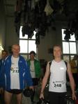 Nur in leichte Laufsachen geschlüpft, hängten die Sportler ihre Kleidung an großen Haken auf. Mit einer langen Kette wurden die Sachen dann unter die Hallendecke gezogen. Wie bei den echten Bergleuten auch, ist die Kleidung nur dort vor Verschmutzung geschützt. Weiterhin ausgerüstet mit Helm und Grubenlampe, eilten die Läufer durch das feuchtkalte Herbstwetter zum Brügman-Schacht. Der Förderkorb ließ nicht lange auf sich warten und schon bald wirbelte die 30 Grad warme Abluft vorbei. Nach drei Minuten Abwärtsfahrt bis auf 680 m Tiefe, eröffnete sich den Teilnehmern ein Erlebnisbergwerk der Superlative. Die musikalische Begrüßung durch die Bergmannskapelle nahmen die noch tauben Ohren nur gedämpft wahr. Aber den Sportlern und gut 150 Zuschauern blieb noch genug Zeit zur Akklimatisierung.
