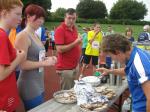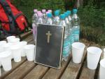 Spätestens mit dem Startschuss über 13 Kilometer waren die Gedanken an den bevorstehenden Muskelkater verschwunden und langsam reihte man sich im Tross der Laufverrückten ein. Die ersten sechs Kilometer verliefen in leichten Wellen, bevor die berüchtigte Treppe hinauf zum Gläsernen Mönch den Lauf abrupt stoppte. Quasi im Gänsemarsch zog sich die Menschenkette pustend die 230 Stufen hinauf, bis ein Mann im Mönchsgewand mit kühlem Nass und Bibel das Ende der Qual erahnen ließ. „Bitte lieber Gott, heile mich von dieser Laufkrankheit!“, konnte man vielen Gesichtern scheinbar entnehmen. Aber weit ab vom Start ging der Weg nur weiter und das zum Glück dann auch bald wieder bergab. Unaufmerksam und wie immer der Fotografie verfallen, stürzte Jens-Uwe Börner über eine Wurzel und konnte nun eine Wunde am Knie sein eigen nennen. Zu diesem Zeitpunkt gab er dann auch Schmidtschneiders Verfolgung auf, widmete sich ganz seinem Hobby und hakte den Lauf als gute Trainingsvorbereitung für den Magdeburg-Marathon ab.