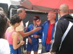Nienburg feierte in der letzten Woche nicht nur 1050 Jahre Stadtgeschichte, Nienburg blickt auch bereits auf 125 Jahre Sport zurück. Und Bürgermeister Markus Bauer dachte sich für dieses Jubiläum einen ganz besonderen Wettkampf aus. Eingeladen und zum Duell herausgefordert wurde der größte Sohn der Stadt: Marathon-Doppel-Olympiasieger Waldemar Cierpinski. Gerne nahm der sympathische Sportler die Einladung des Bürgermeisters an und lief sich bereits mit den Kleinsten beim Bambinilauf warm. Eine ganze Stadtrunde liefen anschließend die Schüler, während die Jugend bereits drei Runden absolvierte. Vorbei an der Festmeile, hinunter über Kopfsteinpflaster und wieder hinauf durch die kleinen Nienburger Gassen, kamen dann die neun Bode-Runners der Gaensefurther Sportbewegung ganze sieben Mal auf ihre Kosten. Die Stimmung an der Strecke war großartig, Moderator und Publikum heizte den Läufern ordentlich ein. Doch wo war Waldemar? Er wich seinem „Konkurrent“ nicht von der Seite, gab nebenbei hilfreiche Lauftipps und genoss sichtlich das Bad in der Menge. Gewertet wurden bei dieser Premiere nur die ersten drei Einläufe der Männer und Frauen, auch auf eine Zeitmessung wurde verzichtet, denn es stand der Spaß im Vordergrund. Großes Kino abschließend auf der Festbühne, wo die Prominenz die Platzierten mit Medaillen ehrte.