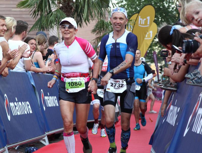 Abschließend dann das „Anstrengendste“. Beide sind eigentlich sehr gute Läufer, aber bei fast 50°C auf dem Asphalt und nach dem schon großen Tagespensum, war das der schlimmste Teil. Durch eine Streckenänderung wurde zwar schon mehr Schatten geschaffen, aber ein Großteil war in der prallen Sonne am Mainufer zu absolvieren. Man freute sich schon immer auf die nächste Verpflegungsstelle alle 2km: Eis, Schwämme, Cola, Wasser.... Die Pausen musste man sich gönnen, daher auch die recht langsamen Laufzeiten über die über 40km. Stefanie musste ab Kilometer 15 mit Blasen kämpfen wegen der durchnässten Schuhe. Stefan kam trotz reduzierten Lauftrainings besser durch als erwartet. Zufällig trafen sich beide an der letzten Wendeschleife und konnten so gemeinsam Hand in Hand ins Ziel laufen.(Laufzeit Stefan 4:37h und Stefanie 5:01h) Das war am Ende doch ein schöner Abschluss. Stefanie belegte Platz 10 und Stefan Platz 145 in ihren Altersklassen (beide AK50) mit einer Gesamtzeit von 13:14 Stunden. Bei knapp einem Drittel Aussteigern oder Nichtstartern war man am Ende über den gewonnenen Kampf mit der Hitze zufrieden und weniger kritisch mit den Zeiten.