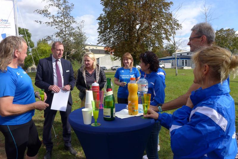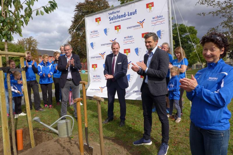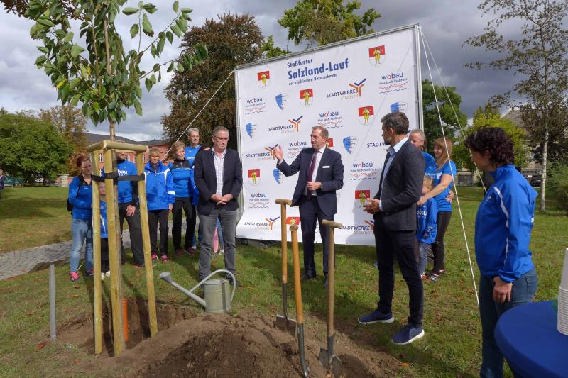 Bereits Ende Juni wurde bekanntgegeben, dass auch der Ausweichtermin für den 3. Staßfurter Salzland-Lauf am 25. September 2020 nicht stattfinden wird. Stattdessen passte nun die geplante Baumpflanzaktion am Stadtsee perfekt in die Europäische Nachhaltigkeitswoche der Vereinten Nationen. Über das Portal #tatenfuermorgen setzte die Laufgruppe der Gaensefurther Sportbewegung zusammen mit ihren Unterstützern das Projekt „KRAFT PFLANZEN - LEBEN ATMEN“ in die Tat um. „Unser Baum für den nötigen langen Atem und die Hoffnung, im nächsten Jahr wieder den Staßfurter Salzland-Lauf starten zu können!“, so die Organisatoren. Zum Nachhaltigkeitsziel waren sich alle einig, denn Bäume binden das schädliche CO2 und liefern uns den lebensnotwendigen Sauerstoff. Letzteres nahmen die Bode-Runners zum Anlass, Oberbürgermeister Sven Wagner, Ralf Klar und Eugen Keller als Geschäftsführer der Wobau und Stadtwerke, ein druckfrisches Gaensefurther Laufshirt zu überreichen. Damit ausgestattet und als Ehrenmitglieder des Vereins aufgenommen, sind alle drei eingeladen, eine Laufstrecke zum 3. Staßfurter Salzland-Lauf persönlich anzugehen. Ob als Walker oder Läufer auf der 1,5 Kilometer langen Strecke, den sechs oder sogar zehn Kilometern ist dabei vollkommen egal, denn den Bode-Runners ist es wichtig, den Laufspaß an der frischen Luft zu vermitteln, fit für den Alltag zu werden und vor allem, Staßfurt zu bewegen - 28. Mai, bist auch du dann mit dabei?