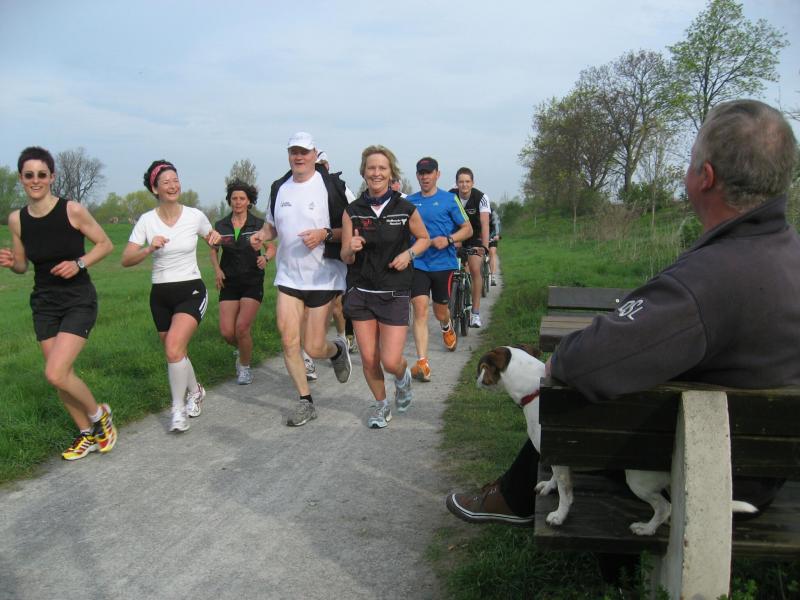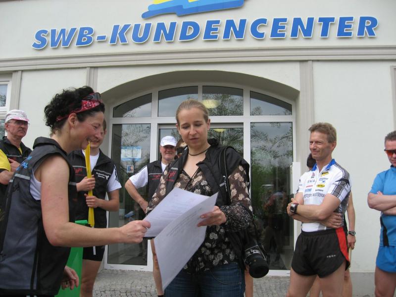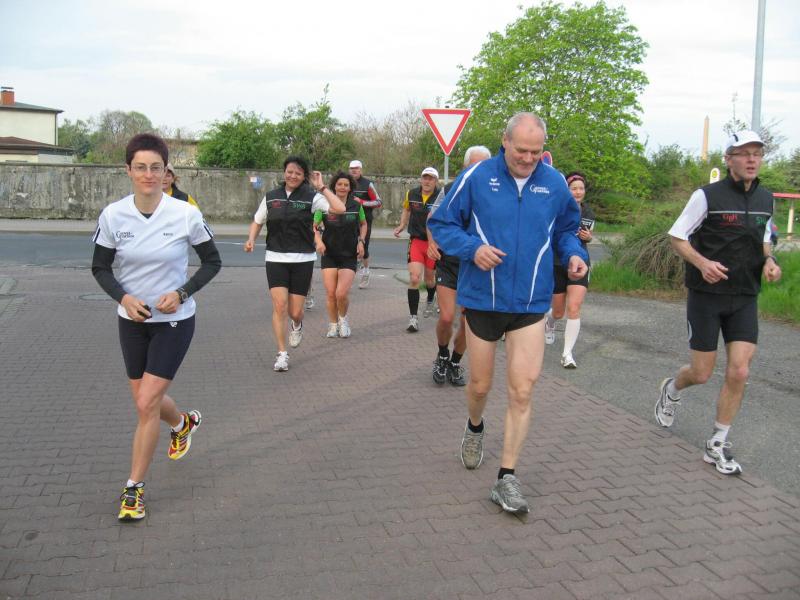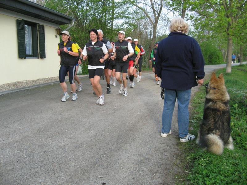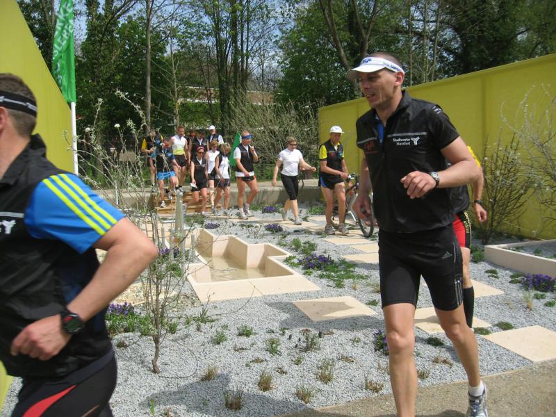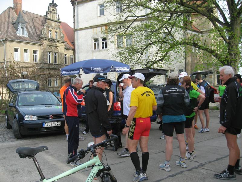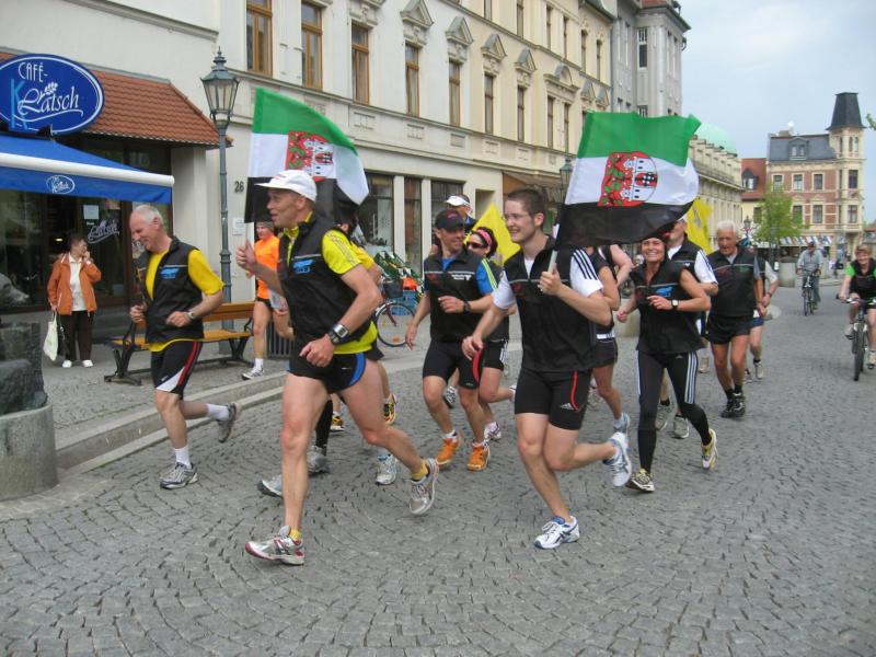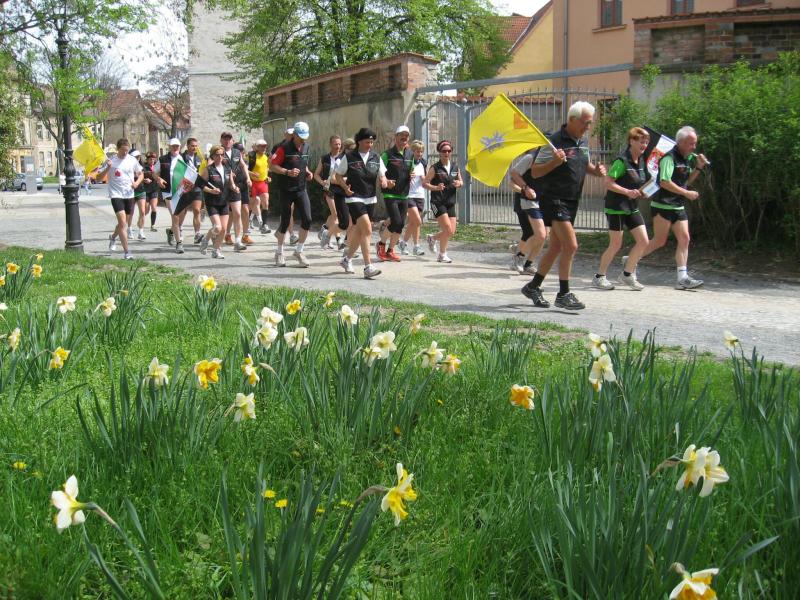 Nachdem sich zu früher Stunde bereits eine große Gruppe von Läufern der beteiligten Laufgruppen vor der Gaensefurther Schlossbrunnen Wüllner GmbH eingefunden hatte, verabschiedete deren Geschäftsführer Horst Braunisch die Teilnehmer, nicht aber ohne ihnen einen PKW voll mit erfrischendem Naß mit auf die Reise zu geben. Über die Roßbahn ging es dann zur 1. Etappe nach Staßfurt zu den Stadtwerken, wo die Läufer schon von OB René Zok und Betriebsangehörigen erwartet wurden. Die Übergabe der Staffelstäbe und die Einnahme einer kleinen Wegzehrung hingegen mussten zügig abgewickelt werden, hatte man doch durch einen Termin bei der LAGA in Aschersleben einen straffen Zeitplan vorgegeben. Wenn die Landesgartenschau für die älteste Stadt Sachsen-Anhalts das absolute Highlight des Jahres ist, warum nicht auch in den diesjährigen Stadtwerkelauf einbinden, dachten sich die Läufer von Ascania Aschersleben und sorgten damit für eine nette Bereicherung der Tagesplanes. Bei warmen, aber angenehmen Wind ging es weiter nach Bernburg, entlang der Bode und der Saale, deren Auen sich frühlingshaft geschmückt zeigten. Schon allein dieses Flair entschädigte für so manche Strapazen. In Bernburg bei den Stadtwerken angekommen, folgte dann der gewohnt herzliche Empfang mit Übergabe der Grußbotschaften, ergänzt durch einen leckeren Imbiß und weiter ging’s. An Verpflegung unterwegs mangelte es ebenfalls nicht. Die von Gaensefurther gesponserten Getränke und die Lunchpakete vom Speiseservice RiRo ließen diesbezüglich fast keinen Wunsch offen. Hatte trotz alledem ein Aktiver konditionelle Probleme, konnte er sich in einem der vier Begleitfahrzeuge erholen. 2 Sportler mussten leider ihren Plan, die gesamte Strecke durchzulaufen, nach 50 km aufgeben, denn das hohe Lauftempo forderte seinen Tribut. Bei dieser Eile übersah dann in den engen Promenaden von Aschersleben prompt ein Läufer einen Poller und es kam zu einer schmerzhaften Kollision. Aber zum Jammern blieb wenig Zeit, denn die Landesgartenschau wartete. Auf der Bühne im Weingarten war dann einige Prominenz versammelt und mittendrin unsere Helden mit den flinken Beinen, überwältigt vom folgenden Blitzlichtgewitter. Nachdem die eigentliche Mission des Laufes, die Übergabe einer Grußbotschaft auch an die Stadtwerke Aschersleben abgehandelt war, die die gute Zusammenarbeit auf kulturellem, wirtschaftlichen und natürlich sportlichem Gebiet dokumentieren soll, folgte die letzte Etappe der insgesamt 70 km langen Strecke.