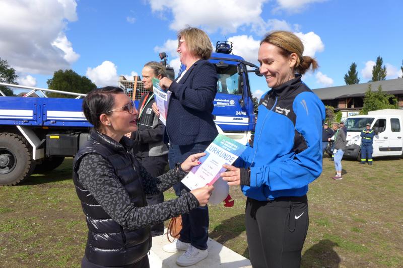 Und ein weiteres Rennen war an diesem Sonntag von großer Tragweite, hatten doch beim 50. Berlin Marathon 54.280 Finisher bei knackig kaltem aber sonnigen Wetter mal wieder Gänsehaut beim Durchlaufen des Brandenburger Tors. 50 Jahre Marathongeschichte, 50 Jahre Emotionen pur. Eine Veranstaltung die zu den größten Marathons der Welt zählt und bei der bereits 13 Weltrekorde erlaufen wurden. Im Jubiläumsjahr gab es keinen neuen Weltrekord, aber eine neue persönliche Bestzeit für Bode-Runner Rinaldo Schielke. Er hatte bereits am Start diese Gänsehaut und mochte seine Freudentränen nicht unterdrücken. Ein hartes Training ging Berlin voraus und nur eine kluge Renntaktik könnte vielleicht eine neue Bestzeiten zulassen, so der Plan. Von den vier großen Startwellen wurde Schielke kurz nach den Profis auf den 42,195 Kilometer langen Kurs geschickt. Ganze zehn Minuten dauerte es vom Startschuss bis zum Überqueren der Startlinie. So lief er bis zum Halbmarathonpunkt ziemlich entspannt mit dem Strom: „Es war einfach zu voll, um von Anfang an mein Tempo zu laufen. Da hätte man schon Slalom laufen müssen und das kostet zu viel Kraft!“, so Schielke, der nach seinen fünf absolvierten Marathons an Erfahrung gewonnen hat. Bis Kilometer 30 wurde das Tempo dann stetig gesteigert: „Es ging mir einfach super!“ So super, dass er für die letzten zehn Kilometer nur 43 Minuten brauchte und nochmal einige Plätze gut machen konnte. Doch die Platzierung spielte in diesem riesigen Starterfeld überhaupt keine Rolle: „Ich habe wirklich jeden Meter genossen und stand mit neuer Bestleistung in der Sonne Berlins!“, so ein überglücklicher Bode-Runner im Ziel. Auch Nancy und Olaf Bothe sowie Jens Schlottag gehörten an diesem Sonntag zu den Berlin-Runners. Allein die Möglichkeit, bei diesem Marathon am Start zu stehen, war schon ein großes Glück. Schnell waren die begehrten Startplätze ausgebucht und nur das Los oder die Warteliste entschied über eine Teilnahme. Schlottag ist süchtig nach Berlin und stand bereits zum elften Mal in einem Startblock. Dass er bei Kilometer 35 seine Frau als Streckenposten treffen würde, war neu auf seinem langen Weg durch die Hauptstadt. Nicole Schlottag war nämlich eine von über 6.000 Helfern an und um den Berlin Marathon. Schielke flog nur so an ihr vorbei, und Zeit, um vielleicht von den Bothes ein Foto zu machen, blieb auch nicht. Für den Ehemann hatte sie dann aber ein paar Sekunden, um ihm für die letzten Kilometer Motivation mit auf den Weg zu geben. „Es war eine fantastische Atmosphäre an der Strecke zum 50. Jubiläum!“, resümierte ein überglücklicher Schlottag im Ziel. Egal, auch wenn bei Olaf Bothe die Zeitmessung nicht funktionierte, so freute sich doch seine Frau Nancy über eine Verbesserung um sechs Minuten zu ihrem allerersten Marathon voriges Jahr, auch in Berlin.