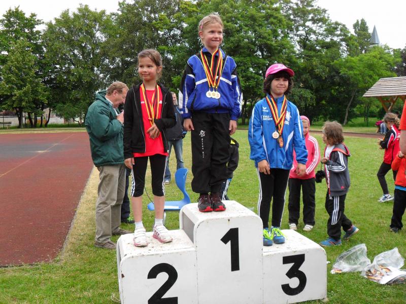 Nina hingegen erwies sich als erfolgreichste Teilnehmerin der Gaensefurther. Mit drei persönlichen Bestleistungen zeigte sie sich in Hochform. Dafür wurde sie im Sprint mit 9,18 Sekunden (Vorlauf 9,03s) mit dem Sieg belohnt. Im Weitsprung und  400m Lauf erreichte sie jeweils Platz drei. Der Ballweitwurf brachte der künftigen Erstklässlerin mit 15,39 Meter eine weitere Goldmedaille ein.