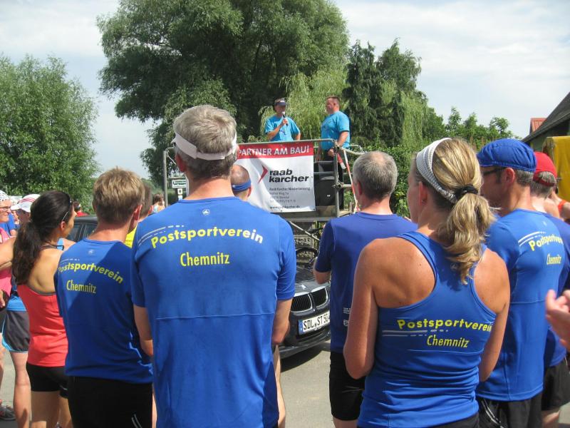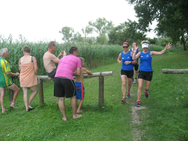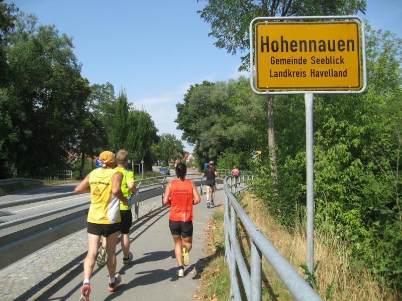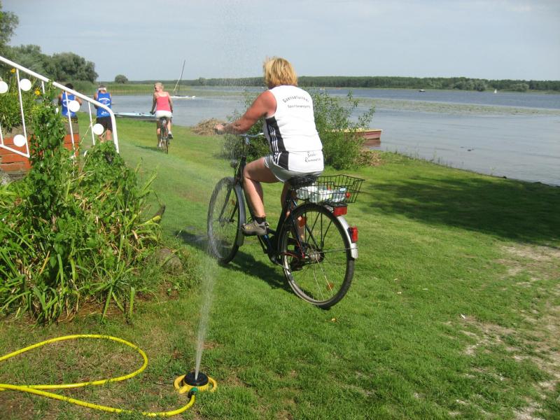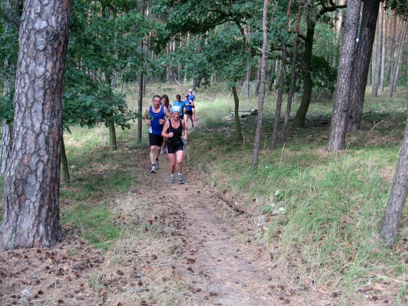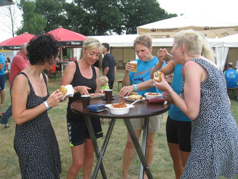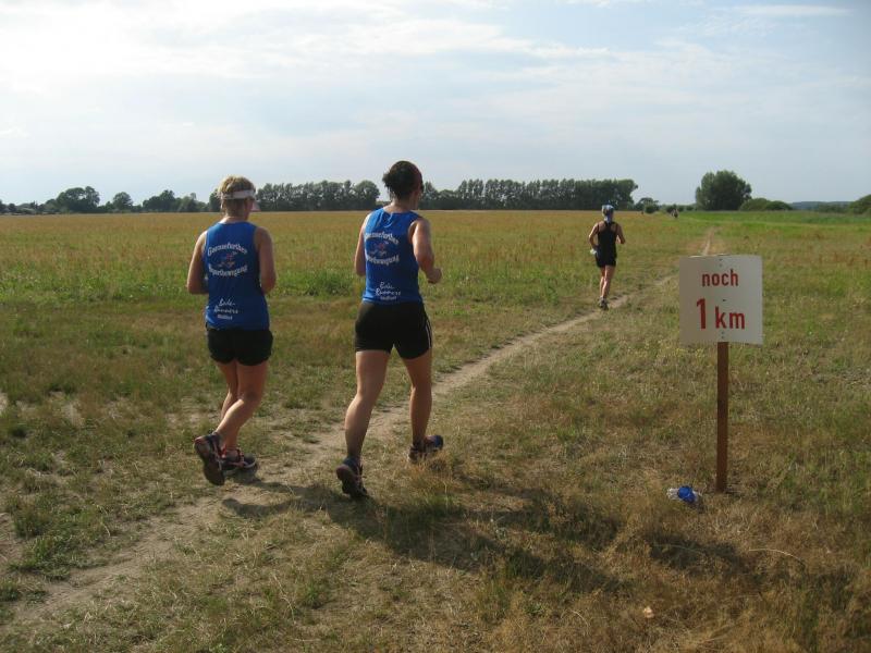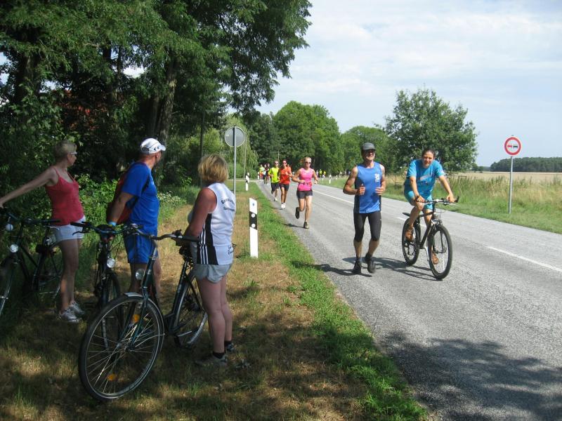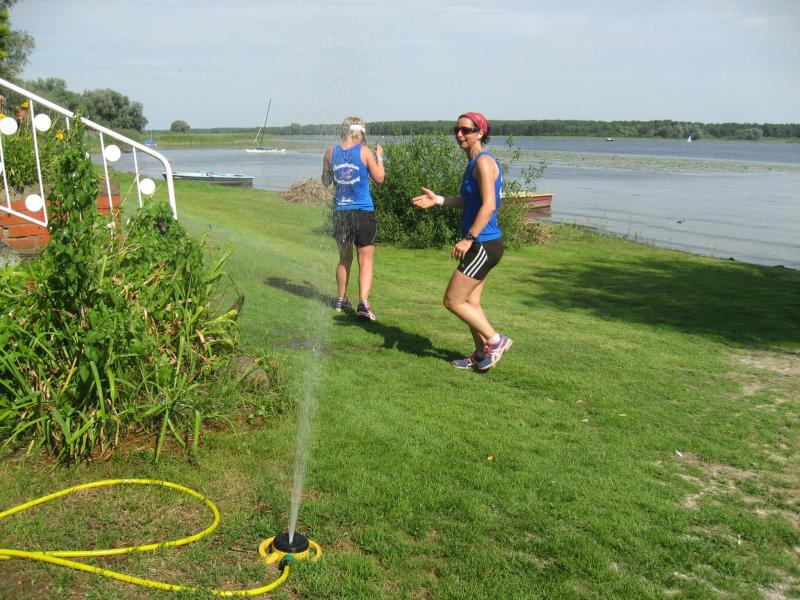 Nachdem in acht Zelten Quartier bezogen wurde, standen der Lauferei, dem Radfahren und natürlich dem grenzenlosen Badespaß im Hohennauener See nichts mehr im Wege. Den ultimativen Höhepunkt des Trainingslagers bildete der 3-Seen-Lauf am Nachmittag des zweiten Tages. Bereits beim Frühstückslauf am Morgen war den Lauffreunden klar: Heute wird es wieder sehr heiß! So gönnten sich die Sportler nach dem reichhaltigen Frühstücksbüfett im nahegelegenen Hotel ein paar faule Stunden am See. Auch der Veranstalter hatte bereits vorgesorgt und den langen Kanten über 25 Kilometer kurzerhand gesperrt. Weiterhin erleichternd kam hinzu, dass der 3-Seen-Lauf ohnehin auf jegliche Zeit- und Altersklassenwertung verzichtet. Mit der Bitte das Lauftempo den Temperaturen anzupassen, erfolgte um 15 Uhr der entgegengesetzte Start über die acht und 21 Kilometer. Während die Kurzstrecke ihre vier Kilometer bis zum Wendepunkt am bewaldeten Seeufer absolvierte, schienen die Laufschuhe auf den ersten vier Kilometern der Langdistanz am heißen Asphalt kleben zu bleiben. Der Verpflegungspunkt bei Kilometer fünf war allerhöchste Eisenbahn. Das Wasser kippte becherweise über die erhitzten Körper. Wem das nicht reichte, Schuhe aus und rein in den See! Weitere heiße fünf Kilometer auf dem Deich folgten, bevor die restlichen elf vorrangig auf angenehm kühleren Waldwegen zu absolvieren waren. Den Radfahrern als ständige Begleiter der Strecke, war sogar das Wechseln auf die Laufstrecke erlaubt. Doch alle Bode-Runner-Läufer hielten in ihrem Element tapfer durch und auch die Fahrrad-„Gäste“ klopften sich am Ende stolz auf die Schultern.