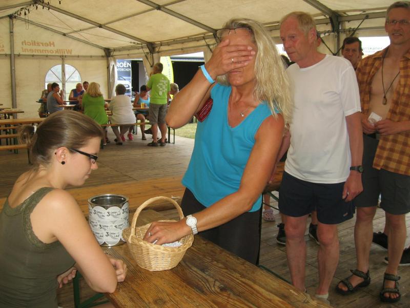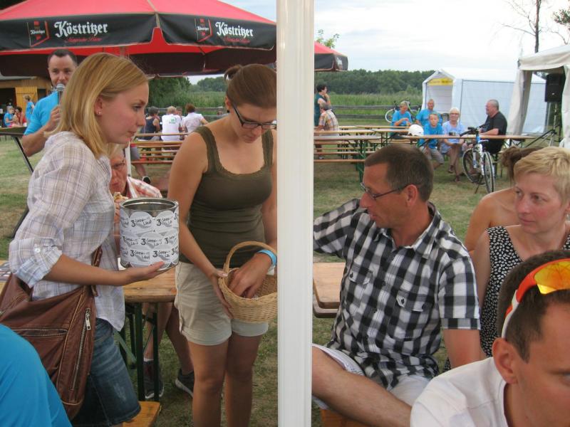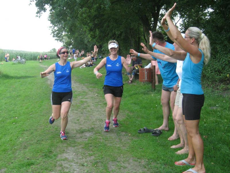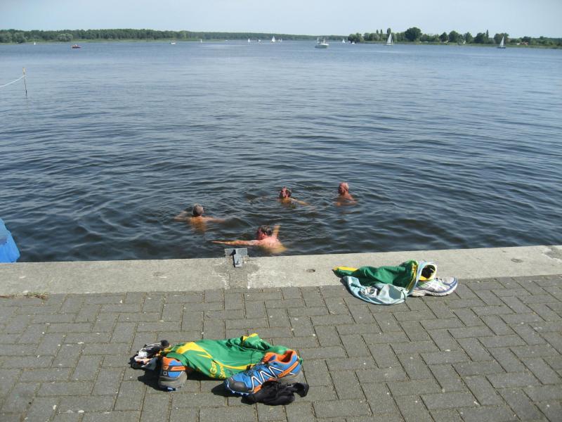 Nach dem Empfang einer schicken Erinnerungsmedaille und etlichen erfrischenden Melonenstückchen hieß es erneut: Schuhe aus und rein in den See! Auf Grund der Streckenkürzung steht bei den Gaensefurthern die Umrundung des dritten Sees nach wie vor aus. Die Teilnahme in 2014 wird damit quasi Pflichtprogramm.