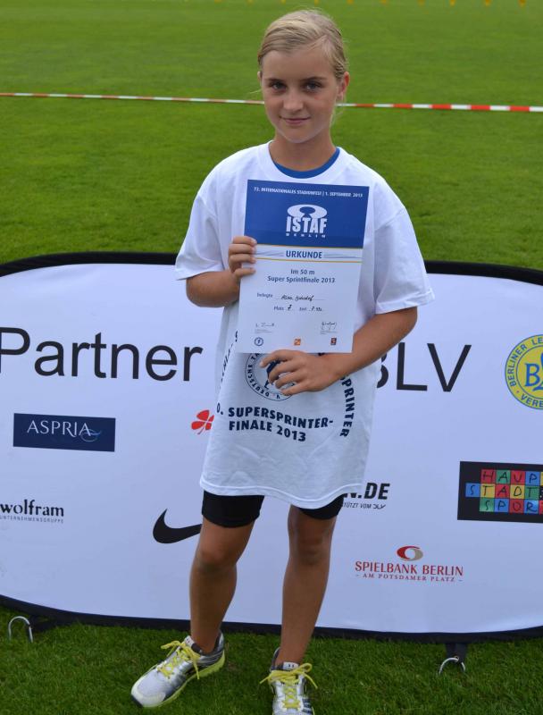Im Olympiakomplex wurden im Rahmen eines Sportfestes aus den angereisten zehn besten Sportlerinnen der Altersklasse w11 in einem nochmaligen 30m Lauf fliegend die sechs Finalisten für den 50m – Endkampf ermittelt. Jeder hatte nur einen Versuch. Obwohl Alina ihr sehr gutes Ergebnis von der Qualifikationsrunde in Magdeburg mit 3,90 Sekunden nicht bestätigen konnte und in Berlin 3,98 Sekunden lief, qualifizierte sie sich zusammen mit Jona Bauer aus Stendal (auch 3,98 Sekunden) für den 6. bzw. 7. Platz im Finale. Da die beiden Mädchen zeitgleich waren und der Veranstalter es nicht übers Herz brachte, noch ein Stechen zu veranstalten, wurde zur großen Freude der Betroffenen kurzerhand ein siebenter Finalplatz vergeben.