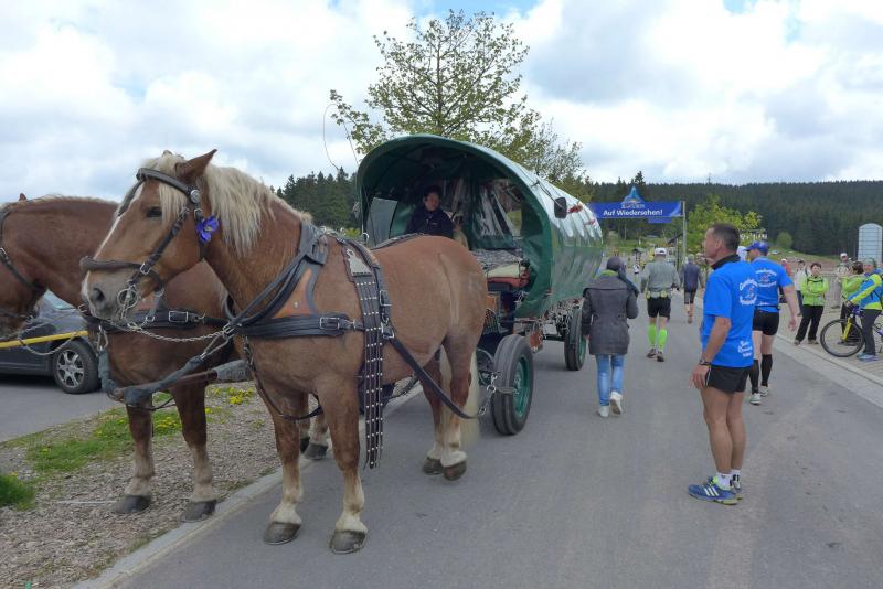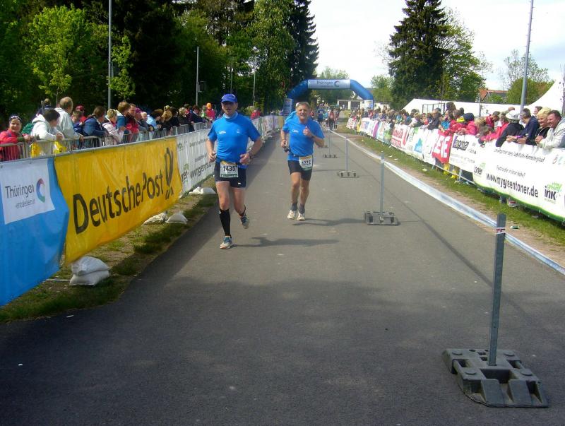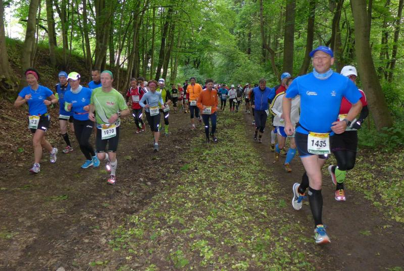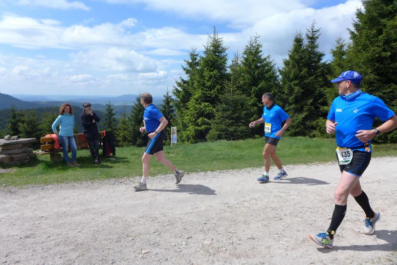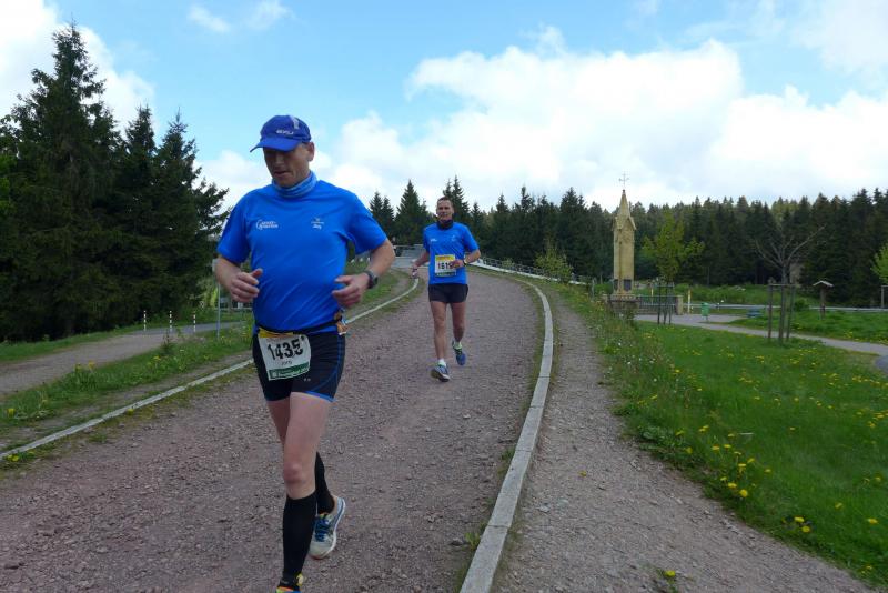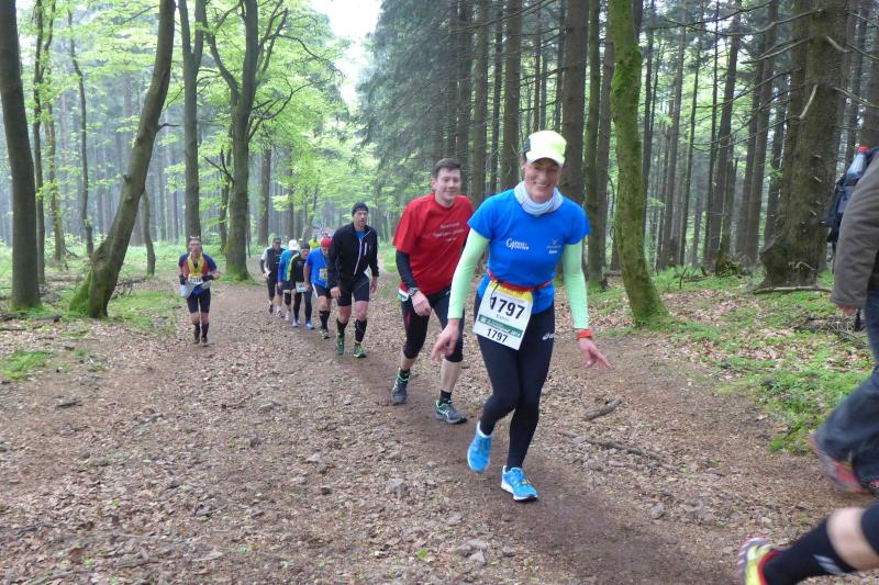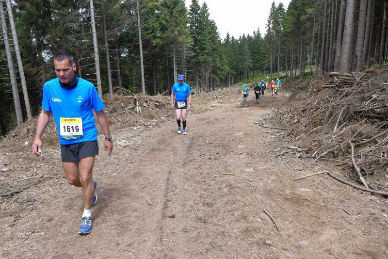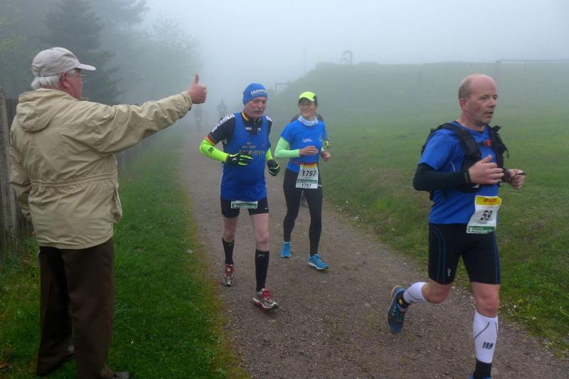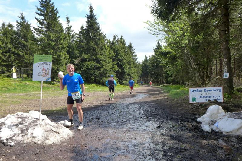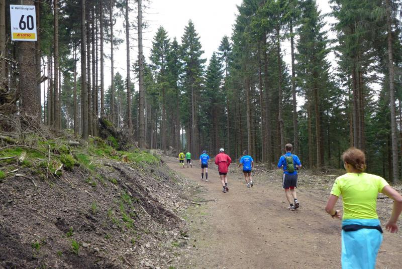 Dem frühen Startschuss um 6.00 Uhr im noch schlafenden Eisenach, gingen viele harte Trainingswochen voraus. Mehrere Marathons, Tempo- und Bergläufe waren absolviert, einzig mit dem Ziel, diesen Ultra-Marathon durchzuhalten. Während es für Jens-Uwe und Sabine Börner der vierte Start zu einem Ultralauf war, bewegten sich Katrin Winkler-Hindricks, Dirk Meier und Jörg Schäper jenseits der 42,195 Kilometer auf unbekanntem Terrain. Leicht fröstelnd, war Kilometer „1“ durch Eisenachs Innenstadt wohl der erste und auch gleich der letzte einfache Abschnitt. Schmunzelnd wurde ein aufgestelltes Ortsausgangsschild registriert, auf dem das Ziel Schmiedefeld mit 72 Kilometern ausgewiesen war. Von nun an ging es bis Kilometer 25,5 stetig bergauf, denn der Große Inselsberg mit 916 Höhenmetern wollte als erstes Etappenziel bezwungen werden. Alle fünf Bode-Runners waren noch dicht beisammen und hatten sich nach drei Stunden Aufstiegsarbeit noch wichtige Körner aufgespart. Bei kühlen fünf Grad Celsius verhinderte dichter Nebel den so hart erkämpften Panoramablick. Zur nächsten großen Verpflegungsstelle "Grenzwiese" ging es rasant bergab auf 746 Höhenmeter. „Das müssen wir nachher alles wieder hoch!“ resümierte Börner und schob sich zur Stärkung lieber noch ein Schmalzbrot in den Mund. Die Frauen beließen es bei warmen Tee und einem schmerzverzerrten Biss in gesalzene Zitronenviertel. Und weiter ging die Reise, jeder in seinem eigenen Tempo. Nicht alle Läufer freuten sich über die inzwischen wärmende Sonne, welche jedoch eine herrliche Sicht vom Höhenweg in das Umland ermöglichte. An der Verpflegungsstation „Ebertswiese“ war die Hälfte der Strecke geschafft. Einen Becher Haferschleim und ein letztes Foto mit Frau Sabine, denn von da an bekam er seine Gattin nicht mehr zu sehen. Beide Frauen spulten Kilometer für Kilometer ab, während in der Männerriege wichtige Fototermine oder Magen- und Muskelprobleme den Vorrang hatten. Ab Kilometer 60 nahm die Strecke einen holprigen Verlauf mit kleinen Hügeln, die inzwischen schon mächtig weh taten. Aber mit "Plänckners Aussicht" auf 973 Metern war der höchste Punkt des Rennsteigs erreicht und als kleine Bergprämie präsentierte man den Läufern die letzten Schneereste. Woher die wohl importiert waren?