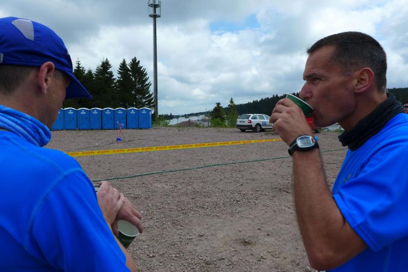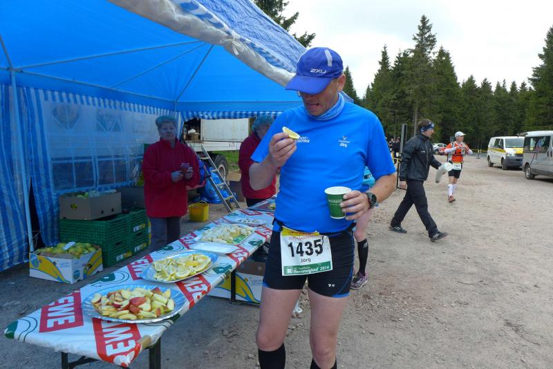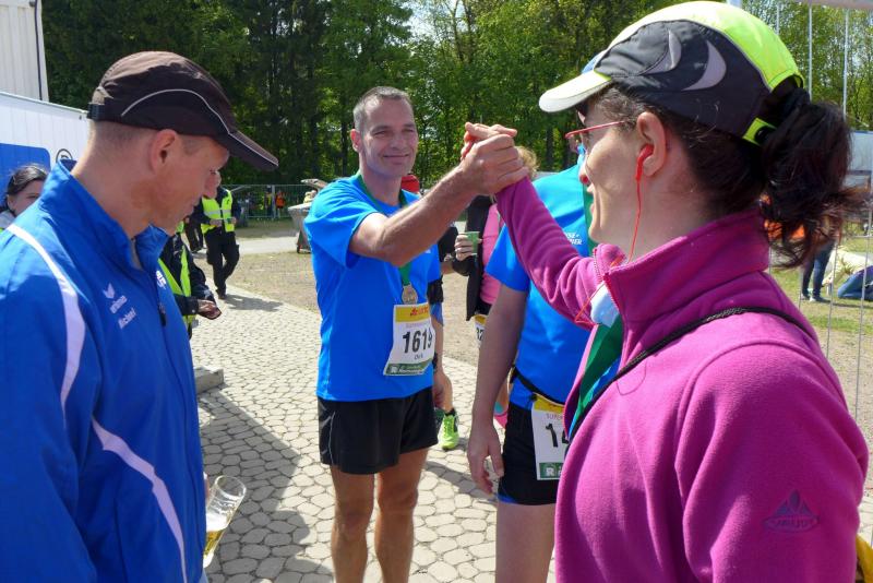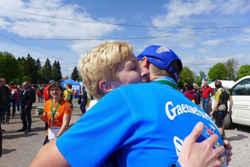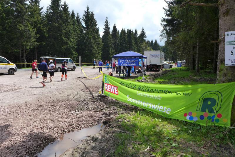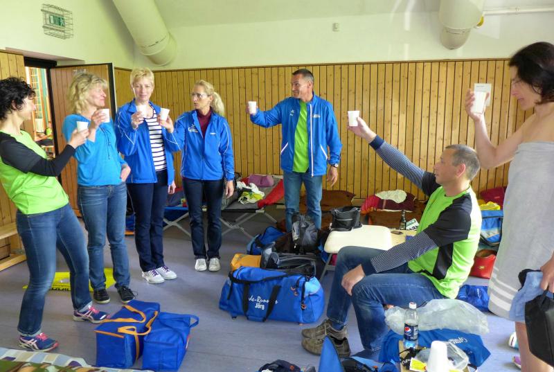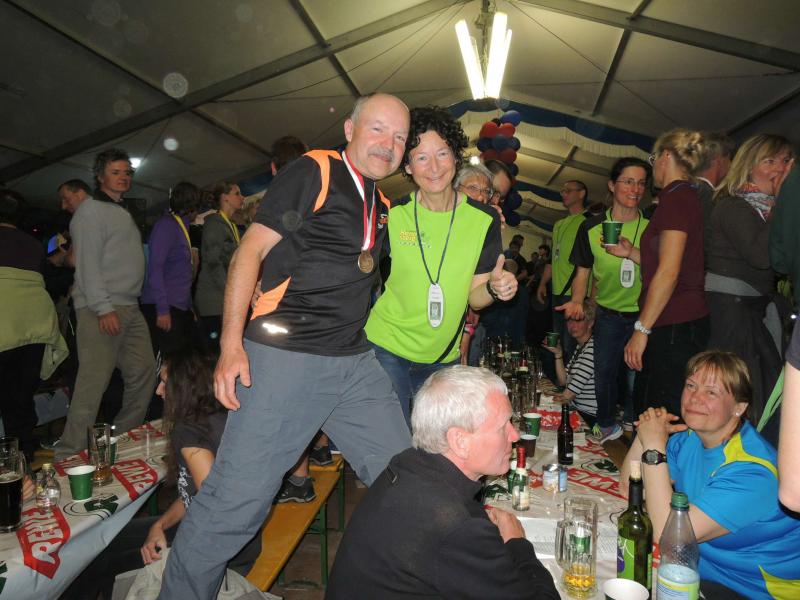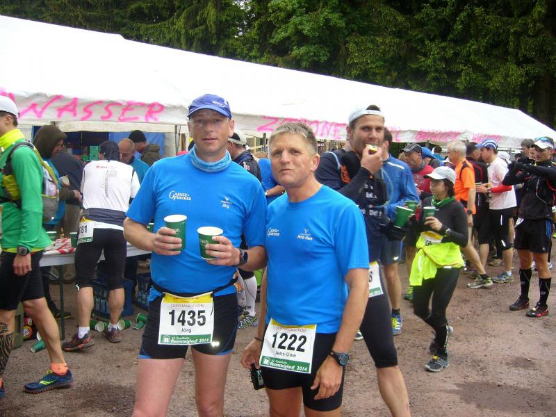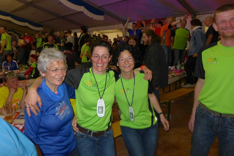 Die beiden Gaensefurther im Ziel hatten indes genug Zeit zum Duschen und warteten zusammen mit dem mitgereisten Fanblock auf die Ankunft der ausstehenden Ultraläufer. Aber auch nach acht Stunden suchte man vergebens nach den blauen Shirts, hätte man zumindest Jens-Uwe Börner längst zurück erwartet (Zielzeit 2013: 07:47:37 Stunden). Umso überraschter bejubelten die Freunde Katrin Winkler-Hindricks, welche nach starken 08:42:32 Stunden ihren allerersten Ultramarathon ins Ziel brachte. Nur sechs Minuten später und damit eine dreiviertel Stunde schneller als im vergangenen Jahr, war mit Sabine Börner auch die zweite Bode-Runners-Frau im Ziel. Bevor man sich dann langsam Sorgen machte, wurde das Männer-Trio zum Glück in der Ferne ausgemacht. Geschafft aber rundum zufrieden, hatten sie sich gemeinsam durchgebissen. Nicht zuletzt auch durch die üppig beladenen Verpflegungsstände. 09:16:00 Stunden Laufarbeit Nonstop hatten die Beine hinter sich. - Ein Ergebnis, dass man natürlich unmöglich so stehen lassen kann! Eine Neuauflage muss her, vielleicht in zwei Jahren. - Dann aber mit dosiertem Training und ohne Würstchen und Schmalzstullen auf dem Weg ins Ziel?