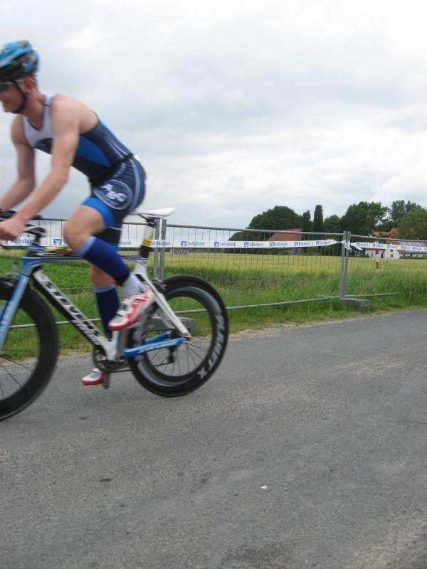 Steffen Schöler, der unterdessen schon fast seine erste von vier zu durchfahrenden Radrunden absolviert hatte, war über seine getroffe Kleiderwahl (langes Rad-Shirt) sehr glücklich. Auch wenn es beim Anziehen wertvolle Zeit gekostet hat, denn der Wettergott meinte es in Niedersachsen nicht ganz so gut mit den Sportlern. Die Maximalwerte von 17°C und keine Sonne sind nicht unbedingt die Lieblingstemperaturen der meisten Triathleten.