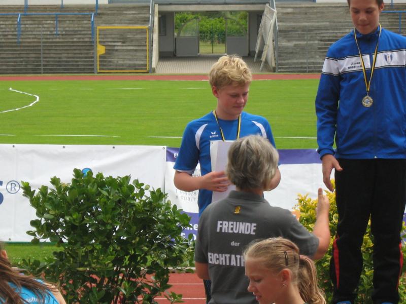 Der Speerwettkampf zog sich über 2 Stunden hin und somit wurde der Konzentration viel abverlangt. Nach dem 1. Durchgang führte Marek die Konkurrenz von 9 Teilnehmern an mit einer Weite von 32,50 Meter. Nach dem 2. Durchgang war klar, dass der Sieg nicht so leicht zu holen war, trumpfte doch sein Mitstreiter Nils Oheim von Turbine Halle mit 36,37 Metern auf. Marek konnte sich bei den nächsten Würfen noch steigern, brachte den Speer im letzten Versuch mit neuer persönlicher Bestleistung bei 35,01 Meter zum Landen, den Hallenser Werfer konnte er jedoch nicht vom Thron stoßen. Somit hatte er die Silbermedaille sicher, denn den Nächstplatzierten ließ er mit 33,00 Metern weit hinter sich. Ein toller Erfolg für den Gymnasiasten aus Tarthun, der erst am Anfang seiner Karriere in dieser Disziplin steht.