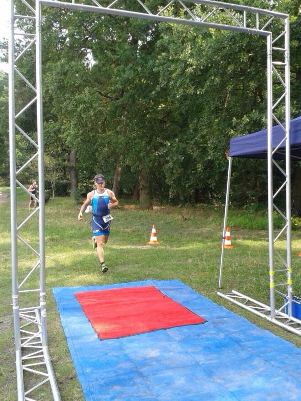 Am schönen Wannsee im Grunewald veranstaltetet ein Berliner Triathlonverein einen Triathlon über die Distanzen 1 km schwimmen - 24 km Radfahrern - 6 km laufen. Gemeinsam mit 50 weiteren Triathleten standen die beide pünktlich um 10:00 Uhr am Start zum 2. Crosstriathlon Berlin. Bei angenehmen Wassertemperaturen war das Tragen des Neoprenanzuges verboten. Es wurden zwei Runden zu je 500 m im Wannsee geschwommen. Blauwitz und Rosenmeier absolvierten das Schwimmen gemeinsam und hatten auf die Spitze ca. 3 min verloren, befanden sich aber immer noch im ersten Drittel des Feldes. Der Wechsel klappte bei beiden ohne Probleme und nun ging es auf 6 anspruchsvolle Radrunden durch den Grunewald. Zum Anfang jeder Runde ging es ca. 1 km auf sandigem Untergrund Bergauf und gespickt mit einer Tragepassage stellte sich der Radsplit als sehr anspruchsvoll heraus. Die beiden Gaensefurther kamen gut mit den Bedingungen zurecht und fuhren im Feld immer weiter nach vorne. Durch die Überrundungen anderer Teilnehmer hatte man den Überblick verloren und so sollte sich erst im Wechselgarten herausstellen an welcher Position man lag. Blauwitz kam als erster der beiden in die Wechselzone. Er zählte drei Räder und lag somit an Position vier. Die abschließenden 6 km Crosslauf gingen über 4 Runden. Schon beim Rauslaufen aus dem Wechselgarten sah Blauwitz den Drittplatzierten und machte sich auf die Verfolgung. Nun zahlte sich das harte Training der letzten Wochen aus. Schnell schloss er auf den Dritten auf und durch eine weitere Tempoverschärfung konnte er sich schnell lösen. Trotz bester Laufzeit an diesem Tag reichte es dann nicht mehr, die beiden vor ihm liegenden noch zu stellen. Auch bei Rosenmeier lief es auf dem Rad sehr gut und er wechselte als 13. auf die Laufstrecke. Hier konnte er von Anfang an gut Tempo machen und seinen 13. Platz im Gesamtklassement verteidigen. Am Ende wurde er mit dem Sieg in der AK 50 belohnt.