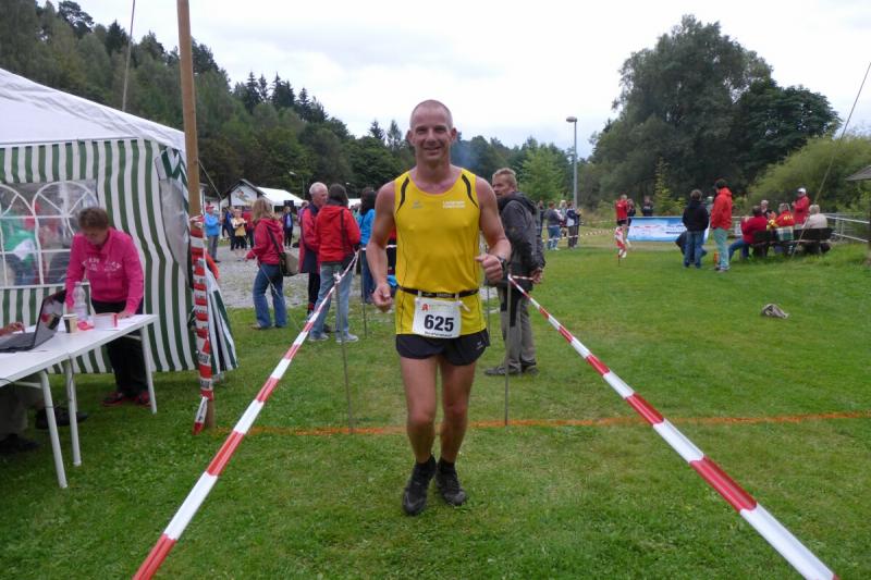 Über herrliche Wald- und Wiesenwege war bald die Talsperre Königshütte erreicht, dann ging es rasant bergab, bis den Läuferbeinen der nächste Anstieg zur Ruine Königsburg bevorstand. Es roch nach frisch geschnittenem Kiefernholz und übergroße Pilze grüßten vom Wegesrand. Am Verpflegungsstand nach 9,5 Kilometern trennten sich die Strecken und Renate Liedtkes erster Platz in der Altersklasse W60 war nur noch 500 Meter entfernt. Für die Langdistanz ging es wieder auf 500 Höhenmeter, Schwerstarbeit durch matschige Wiesen und über kurvige, wurzelreiche Trampelpfade. Scheinbar war man hier den Wolken so nahe, dass es fein nieselte, was aber eher als angenehm empfunden wurde. Der Wirtschaftsweg vor dem Stausee Mandelholz brachte weitere Erholung, bevor die Fähnchen an den Bäumen die Läufer wieder in den dichten Wald lotsten. Das Teilnehmerfeld hatte sich inzwischen weit auseinander gezogen, so dass man oft keinen Läufer mehr vor sich sah. Der Stausee war umrundet und an der Kalten Bode ging es wieder zurück nach Königshütte.