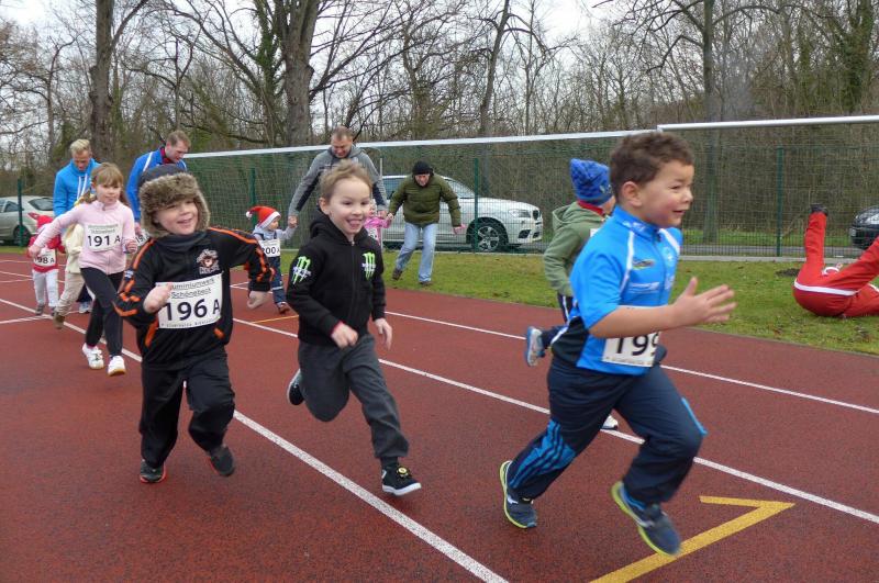 Da hatte der Schuss aus der Startpistole den Nikolaus doch tatsächlich umgehauen! Keine Zeit dem Alten wieder auf die Sprünge zu helfen, lieferten sich doch bereits die Vorschulkinder ein Kopf-An-Kopf-Rennen über die zu laufende 200 Meter-Distanz. Finn Lampe sprintete haarscharf vor Jim Körner und Justin Walter über die Ziellinie, dicht gefolgt von den Mädchen Anna Truin und Jean Linsdorf. Mit etwas Abstand folgten dann auch die Kleinsten, hatten sie schließlich erst einmal zu klären ob der Papa mitzulaufen hat und ob er vielleicht auch die Startnummer tragen könnte? Damit war der 8. Staßfurter Nikolauslauf offiziell eröffnet und von Oberbürgermeister René Zok wurden als nächstes die 15-Minuten-Paar-Läufer auf die Bahn geschickt. Auch viele 7-jährige Sportler liefen in diesem Jahr erstmalig diese Wertungsstrecke. Entsprechend anspruchsvoll war Runde für Runde, auch wenn man sich mit seinem Partner abwechseln konnte. Der eifrige Urkundenschreiber setzte Zahl für Zahl gekonnt auf das Dokument: 97.800 Meter für Douglas Nagel! Auch der Nikolaus und der Stadionsprecher verkünden noch einmal verwundert: 97.800 Meter für Douglas Nagel und Max Deubeler! Was für eine Leistung in 15 Minuten! Oder doch ein Fehler in der Rundenmessung? Schließlich wurde die falsche Berechnungsformel in der Ergebnisliste entdeckt. Eine neue Urkunde wollte Douglas nicht: „Das habe ich jetzt schwarz auf weiß! Das lasse ich mir nicht mehr nehmen!“ Nach entsprechender Listenkorrektur stand fest: Die „Speed Kids“ mit Emilia Trümper und Anna Homuth siegten knapp vor den „Montis“ mit Constantin Schmidt und Tarik Krukowski. Emma Geppert belegte mit Nadine Starke als Team „Lok 2“ den dritten Platz im Gesamtklassement.