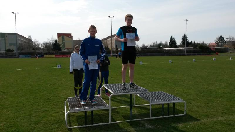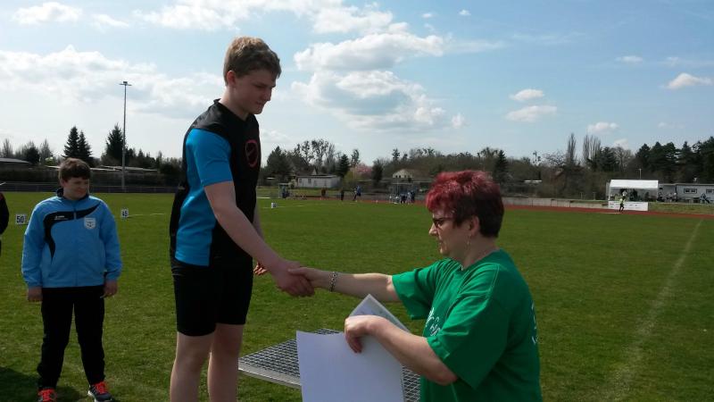 Dann ging es zum Kugelstoßen. Hier schien sich das Blatt zu wenden. Der 1. Stoß von Marek auf magere 9,72 m ließ nichts Gutes hoffen. Mit Stoß 2 und 3 kämpfte er sich zwar an die 10 m Marke heran, blieb aber weit entfernt von der Bestleistung im Januar. Außerdem hatte sein Konkurrent im 3. Versuch eine Weite von 11,54 m vorgelegt, ein Sieg schien in weite Ferne gerückt zu sein. Mareks 5. Versuch landete bei 10,94 m. Nicht schlecht, aber es fehlten immer noch 61 cm zum obersten Podestplatz. Dann machte er das Unmöglich geglaubte möglich und steigerte sich im 6. Versuch um 66 cm. Damit hatte er auch hier den 1. Platz in der Tasche - Siegerweite 11,60 m.
