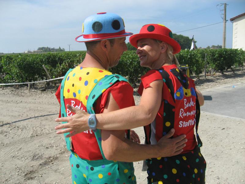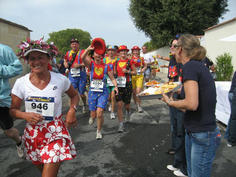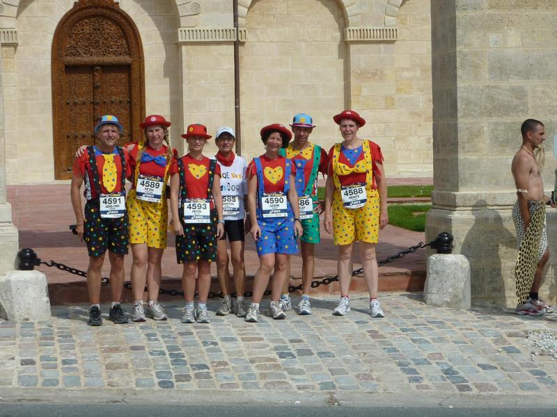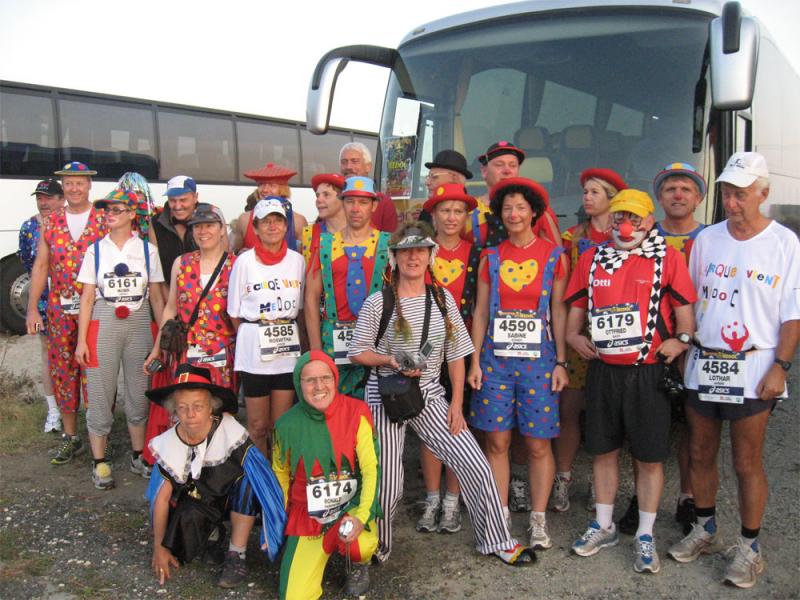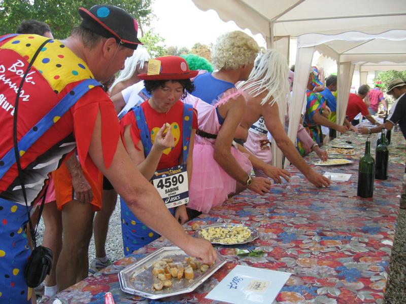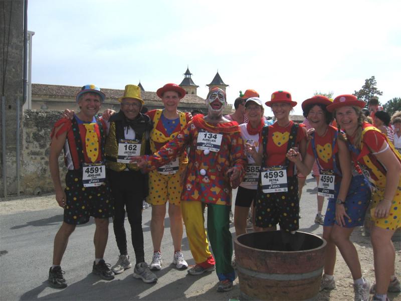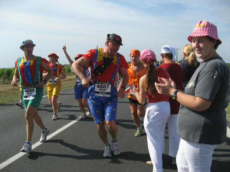 Neun Bode-Runners der Gaensefurther Sportbewegung gehörten zu den glücklichen Teilnehmern am Marathon des Chateaux du Medoc. Zusammen mit Sportlern aus Halberstadt, Aschersleben, Bernburg und Frankfurt bezog man im Feriendorf Lacanau an der südfranzösischen Atlantikküste Quartier. Ein sonnenverwöhntes Paradies unweit der Chateaus, welche sich durch die edelsten Weine dieser Erde ihren Namen machten. Erwartungsvoll begab sich die Gruppe in das Meer der knapp 9.000 Läufer und nach einem fast zwei stündigen Showprogramm, ging es dann wirklich auf die 42,195 Kilometer lange Weinverkostung. Der erste WC-Stopp erfolgte bereits vor dem ersten Kilometerschild, denn der eigene, gut gefüllte Getränkevorrat machte sich nach dem langen Stehen in morgendlicher Kälte bemerkbar. Kein leichtes Unterfangen, hatte man doch die ursprüngliche Laufbekleidung gegen ein Clown-Kostüm eingetauscht. Nachdem alle Hosenträger und Sicherheitsnadeln wieder an der richtigen Stelle waren und man inzwischen von schätzungsweise 4.000 Läufer überholt wurde, verließ die Gruppe unter dem Beifall zahlreicher Schaulustiger Pauillac. Eine Runde um die ersten Chateaus war zu absolvieren, bevor man nach 22 Kilometern den Ort wieder erreichen wollte. Ziel war, diese Strecke ziemlich zügig zu laufen, dann bei Kilometer 22 Renate Liedtke mitzunehmen und den Rest des Marathons gemeinsam zu genießen. Einen ersten erlesenen Tropfen Beychevelle gab es bereits bei Kilometer sieben. À la vôtre! Läufer aus der ganzen Welt prosteten sich genüsslich zu, die Bode-Runners vor jedem Schloss im Fotoshooting. Alle Verpflegungsstände waren üppig gedeckt. Neben frischem Obst reichte man den Läufern Salzgebäck, verschiedene Brot- und Käsesorten, Kuchen und Kekse, Trockenfrüchte, Wasser, Cola und natürlich immer wieder ein Becherchen Rotwein. Nach gut 2,5 Stunden erreichte man wieder Pauillac und Renate übernahm die Tempoarbeit. Mit den Chateaus Mouton und Lafite Rothschild nährte sich die Gruppe einem weiteren Höhepunkt. In der Parkanlage am prunkvollen Schloss, kredenzte man die edlen Tropfen natürlich in Gläsern. Eine logistische Meisterleitung für über 8.000 Läufer! Bereits mächtig dem Alkohol verfallen, ließen es sich einige Läufer nicht nehmen, im Teich der Rothschilds ein ernüchterndes Bad zu nehmen. Außer der zunehmend schwerer werdenden Beine verkrafteten die Staßfurter Läufer die ungewohnte Herausforderung bislang ohne Verluste. Eine Zielzeit von 6:30 Stunden war vom Veranstalter als Zeitlimit vorgegeben, dass müsste doch zu schaffen sein! Inzwischen war Kilometer 36 passiert, die Anstiege zu den höher gelegenen Chateaus lagen hinter den Läufern und es ging hinaus auf die Küstenstraße. Vor einem kleinen Imbisswagen drängte sich die Läuferscharr. Vom dicken Bayonner Schinken schnitt ein waschechter Franzose dünne Scheiben, die fluchs geschnappt, durch die Masse gereicht wurden. Ein leicht salziger Gaumenschmaus für den sich die kleine Pause gelohnt hatte! Nicht weit entfernt roch man bereits das nächste Highlight. Auf großen Tabletts wurden Austern mit Zitronen gereicht. Dazu servierte man den Läufern einen trockenen Weißwein. Für alle Bode-Runners eine Mutprobe die bereits im Vorfeld im Pflichtenheft aufgenommen wurde. Und eine Erfahrung, welche die meisten nicht noch einmal haben müssen. Da zog der Duft von frisch gegrilltem Rindersteak die Läufer schon eher zum nächsten Anlaufpunkt. Wer noch nicht genug hatte, konnte sich dazu auch einen feinen Cognac einschenken lassen. Nach diesen Schlemmermeilen und der brütenden Sonne sehnte man sich nach dem Ende. Nun kam auch noch ein Franzose mit einem riesigen Spiegel auf die Mädels zu. Danke, wir wissen wie es um uns gestellt ist, versuchte man zu übermitteln. Aber höflich lud er an den Straßenrand zur Auffrischung der Schminke ein, schließlich sollte beim Zieleinlauf alles perfekt sein. Nun hatte man also auch noch die Deutschlandfarben auf der Wange und nachdem alle noch ein Stieleis naschten, kamen auch die Kräfte wieder zurück. Ein Blick auf die Stoppuhr: „Das schaffen wir noch unter sechs Stunden!“ Gemeinsam genoss man nach 5:58 Stunden das Überqueren der Ziellinie, über 3.000 Läufer sollten noch folgen. Nicht umsonst spricht man vom „längsten Marathon der Welt“.