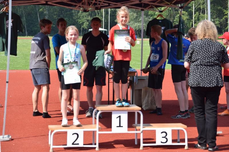 Einen sehr erfolgreichen Tag hatte auch Fabienne Sämisch (w9). Mit 3 persönlichen Bestleistungen (Ball-25,72m (2.), 50m-8,97 (3.), weit-3,19m (3.) durfte sie drei Mal auf dem Podest ihre Medaillen in Empfang nehmen.