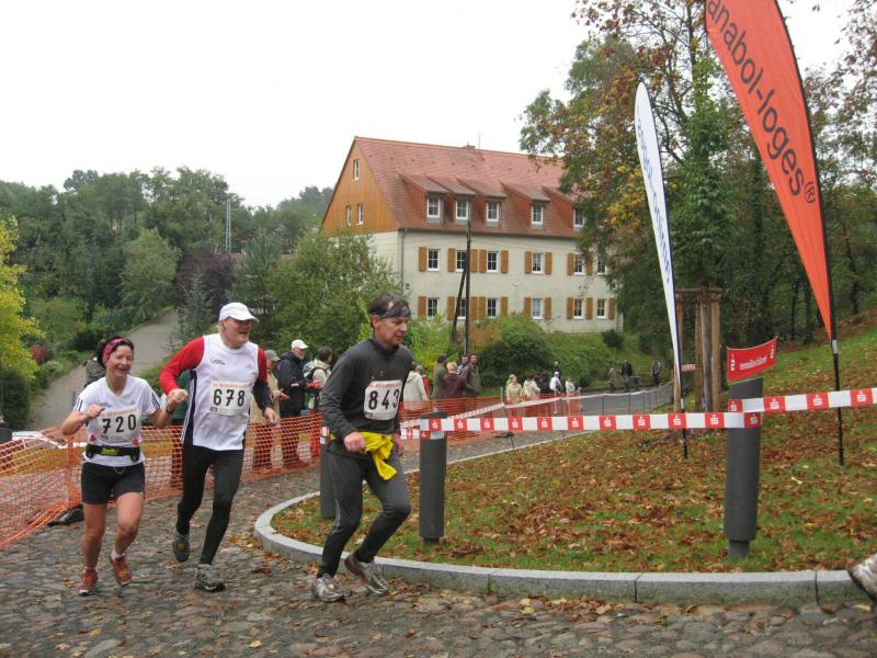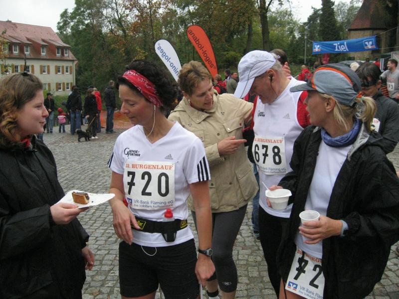 Nicht viel Zeit für die malerische Landschaft und die gut bestückten Verpflegungsstände nahm sich Petra Becker. Im Sauseschritt eilte sie dem Ziel entgegen und überquerte nach bereits 2:14 Stunden die Zeitmessung. Platz drei bei den Frauen in der W40, womit sie nun auch die Hitliste der schnellsten Zeit im Staßfurter Damenteam anführt. Ernste Worte gab es dagegen im Duo Lutz Klauß und Sabine Börner: „Bine verschieß nicht deine ganzen Körner! Denke dran, in einer Woche ist Marathon!“ Und so wurde das Tempo immer wieder herausgenommen. Dementsprechend locker und leicht erreichte man wieder Burg Eisenhardt, wo man nach ausreichend Matsch und Schlamm sehnlichst der warmen Dusche entgegen wanderte.