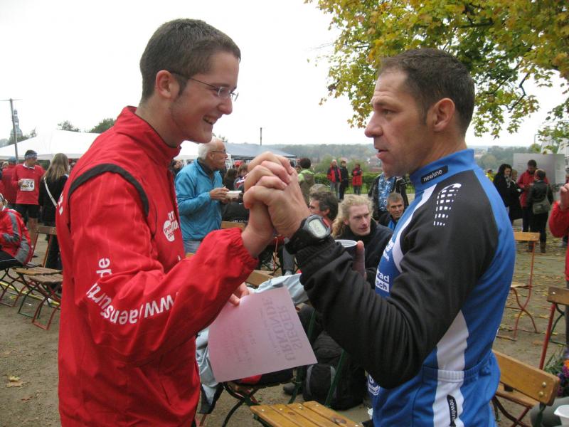 Schnell unterwegs waren Detlef Schäfer und Florian Börner. Beide meisterten wie schon so oft, alle Höhen und Tiefen des Laufes gemeinsam. Eine Fußlänge vor Schäfer (Altersklasse M 45), beendete der Jungspund vom cash´n fun Junior Team der Salzlandsparkasse seine zweite Teilnahme auf dieser langen Distanz. Eine Verbesserung um sieben Minuten bedeutete Platz eins in der männlichen Jugend A und eine Riesenwurst für den heimischen Kühlschrank. Vater Börner indes mit seiner Zeit weniger zufrieden, zweifelte an seinem Trainingszustand. Keine guten Voraussetzungen für einen Marathon.