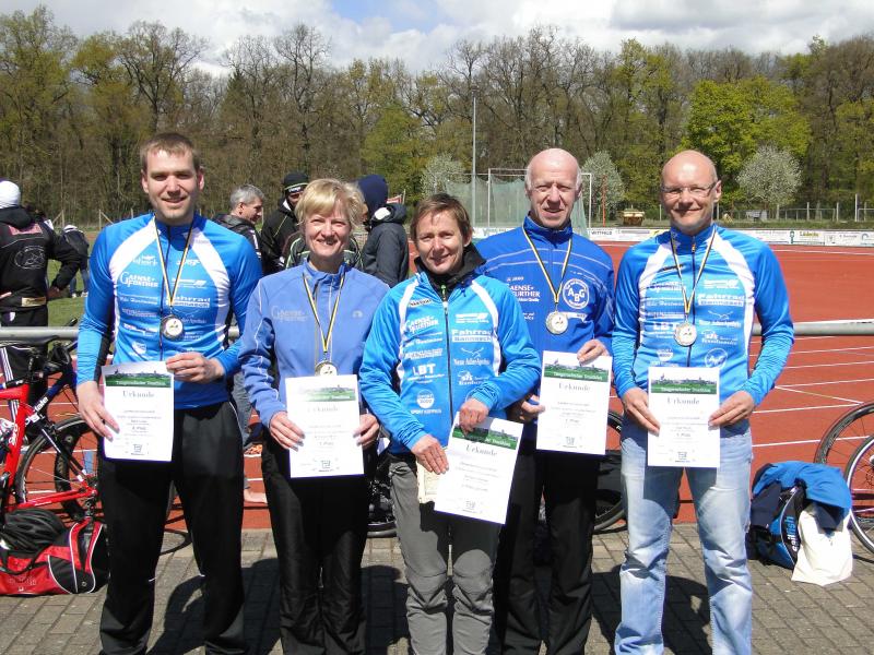 Mit weiteren drei Landesmeistertiteln für Olaf Moch, Jürgen Eisfeld und Annegret Wille sowie einen 2. Platz für Maik Löwe konnten die Gaensefurther als Team beachtlich auftrumpfen. Jürgen Eisfeld hatte noch die Europameisterschaft im Duathlon in den Beinen, bei der er einen 4. Platz erkämpfte. Aufgrund der schlechten Wettervorhersagen wurde der Start bei den meisten eher kritisch gesehen. Kälte, regennasse Straßen und starker Wind sind nicht so nach dem Geschmack der Sommersportler, sondern auch noch recht gefährlich. Sicher nahmen einige Triathleten deshalb Abstand vom Start. Einige Unentwegte ließen sich nicht abhalten und nahmen es als spezielles Training. Mit Hagelschauern und recht frischem Wind war für jeden etwas dabei. Dafür waren die 2 x5km Lauf- und die 28km Radstrecken sehr gut zu bewältigen und alles war hervorragend organisiert. Kalte Hände ließen den Wechsel vom Rad etwas länger dauern, aber der abschließende Laufkurs, sogar mit kurzem Sonnenschein, ließ alles schnell relativieren. Die tolle Teamleistung und die Unterstützung untereinander gaben ein gutes Gefühl und Appetit auf die bald beginnende Triathlonsaison.