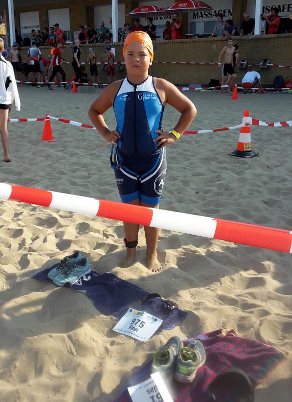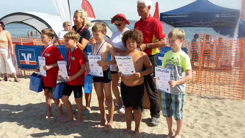 Finn startete auch zum ersten Mal im Freiwasser über 500 m. Annett schwitzte ganz schön, als beide in der Ostsee waren, aber das DLRG hatte die Veranstaltung super organisiert und abgesichert. Mit den Kindern wurde am Strand eine 10 minütige Erwärmung durchgeführt. Auch Finn hatte Spass und ließ sich von den Wellen nicht unterkriegen.