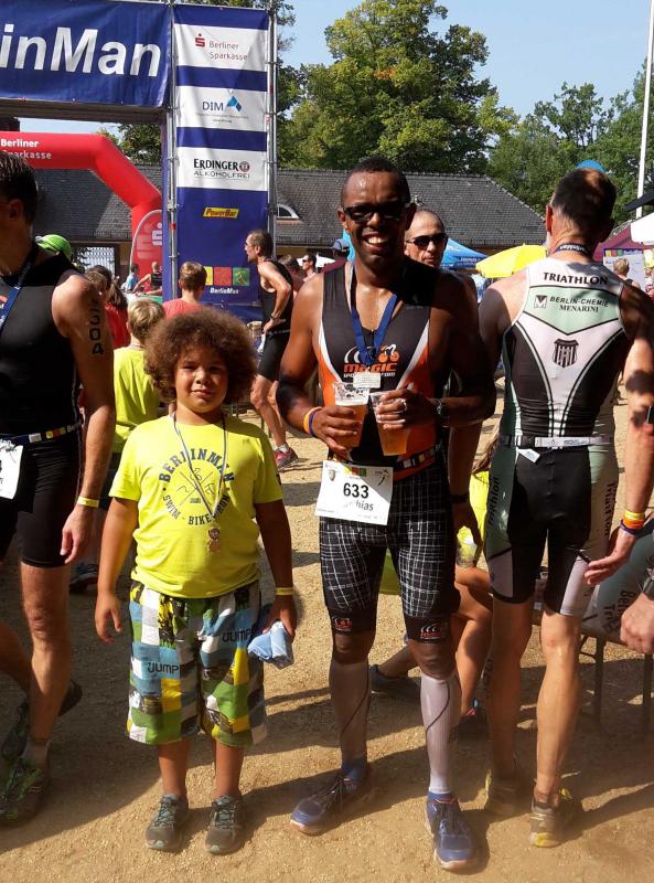 Am Wannsee in Berlin gab es eine Neuauflage des BerlinMan, die auch Familie Lampe zum Mitmachen animierte. Der männliche Teil der Familie war schon lange angemeldet, doch Annett ließ sich mit ihrer Teilnahmeentscheidung Zeit. Leider zu viel, wie sich rausstellte, denn die Startplätze waren am Wettkampftag alle vergeben. Enttäuscht blieb ihr nur übrig, ihren Männern die Daumen zu drücken. Aber es kam für sie noch schlimmer. Mit Entsetzten stellte sie fest, dass der Neoprenanzug von Matthias zu Hause vergessen wurde. Die Hoffnung auf ein Verbot, dass ab 23 Grad Wassertemperatur ausgesprochen wird, erfüllte sich nicht, denn die Säule des Termometers blieb bei 22,3 Grad stehen. Bei einem Mitteltriathlon ist der Neo von Vorteil, zumal in Berlin die Schwimmstrecke 2,2 km beträgt anstatt sonst 1,9 km über diese Distanz. Und das bei Matthias Vorhaben, die 5 Stunden Marke knacken zu wollen. .... Ein harter Kanten und er weit und breit allein ohne Neo.....Am Ende hat alles dennoch gut geklappt. Er kam glücklich ins Ziel, super Radzeit und mit dem Lauf war er auch zufrieden. Keine Krämpfe, keine Schmerzen und das bei 32 Grad. "Es geht also auch ohne", freute er sich über seine Leistung. Seine Zeiten von 49:12 Minuten Schwimmen (inklusive Treppenaufstieg 88 Stufen), 2:41:28 Stunden für 90 km Radfahren und 1:38:39 Stunden für 20 km Lauf können sich sehen lassen, obwohl er mit einer Endzeit von 5:09:19 Std. sein persönliches Ziel nicht ganz erreicht hat. Als 27. in AK TM40 von 69 Teilnehmern und 194. von 488 Männern erschien er auf den Ergebnislisten.