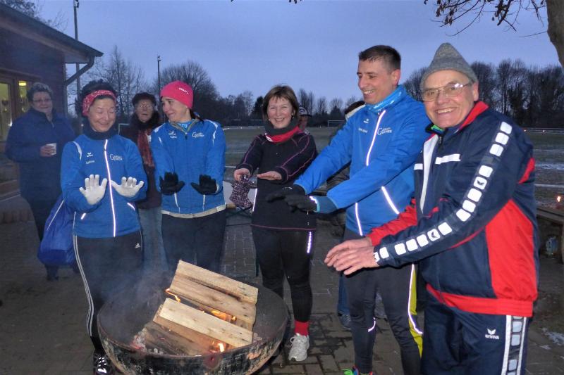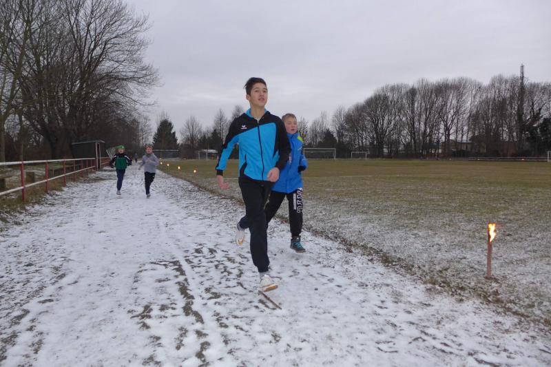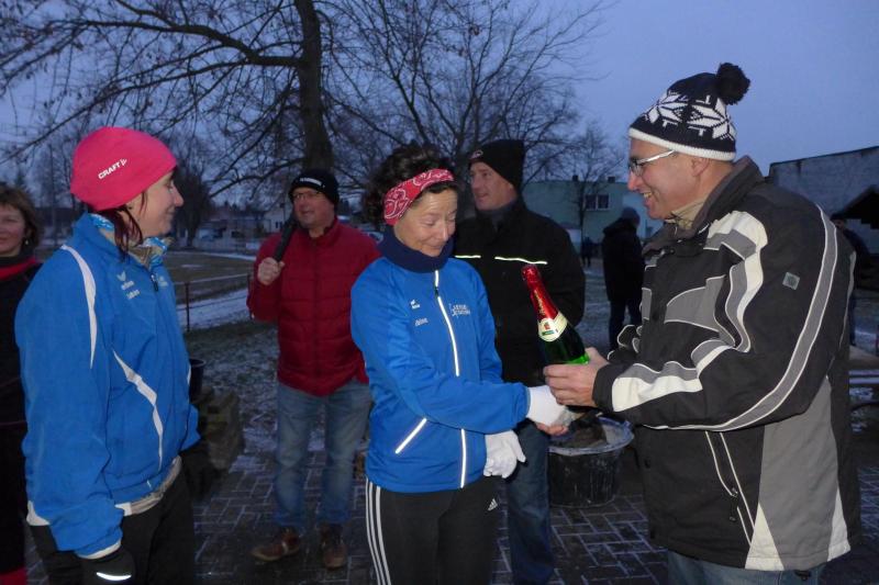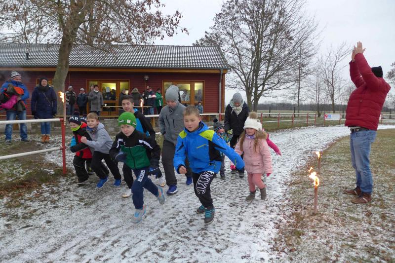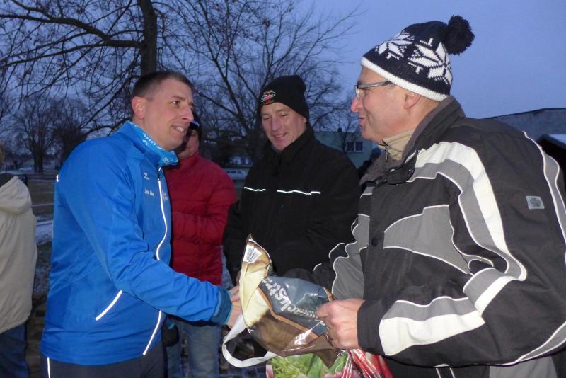 Für ihn ist wichtig, dass die Tradition gepflegt wird. Und dazu gehört eben auch dieser Lauf. Noch wichtiger als Punkte und Platzierungen sind für Krokotsch, dass die Geselligkeit in seinem Verein aufrecht erhalten wird. Dieses Zusammenkommen um die Jahreswende gehört einfach zum Vereinsleben. Und dafür hatten sich die aktiven Sportfreunde wieder mächtig ins Zeug gelegt, schmierten Fettstullen, feuerten den Grill an. Für die Kinder entzündeten Danny Glockenmeier und Philipp Herning Fackeln um den Sportplatz. Nach zwei Runden konnten sich die schnellsten drei – Leon Tangermann, Jonas Stelter und Conner Tangermann – über Gutscheine fürs Erlebnisbad im Salzlandcenter Staßfurt freuen. Alle kleinen Teilnehmer erhielten noch Überraschungseier, natürlich auch die Zwillinge Frieda und Friedrich, die zur Erwärmung sogar eine Runde vor dem eigentlichen Rennen rannten. Die Erwachsenen mussten ein paar Meter mehr durch die Feldflur absolvieren, bevor die Besten ihre Trophäen in Form von Karpfen und flüssigen „Spaßmachern“ in Empfang nehmen konnten. Bei den Frauen war das Andrea Frey, bei den Männern Nico Mahler und als ältester Teilnehmer Peter „Schacki“ Muster.