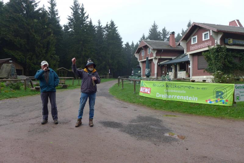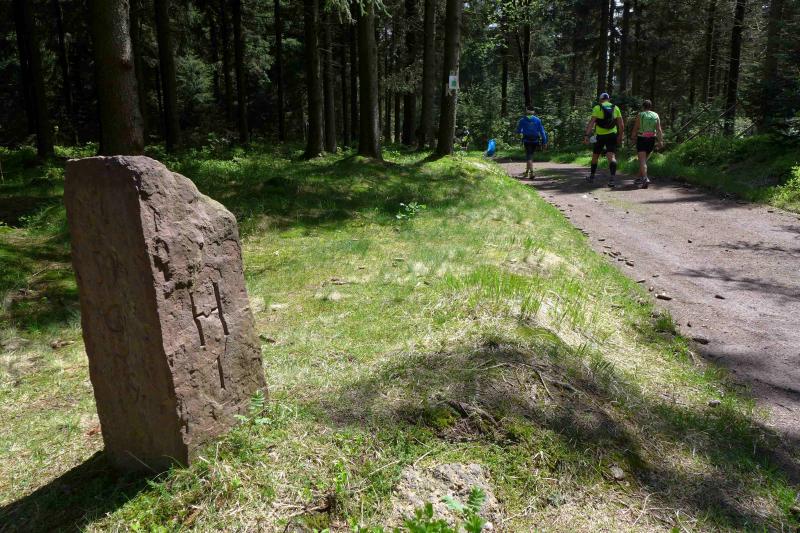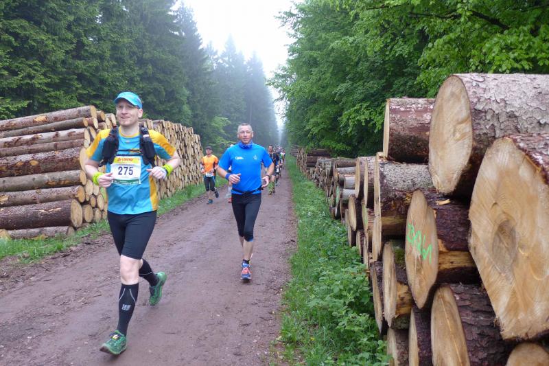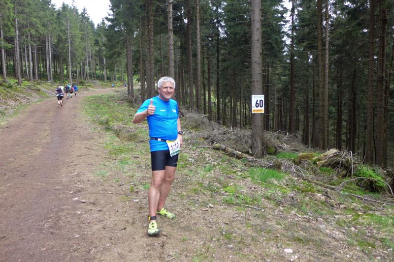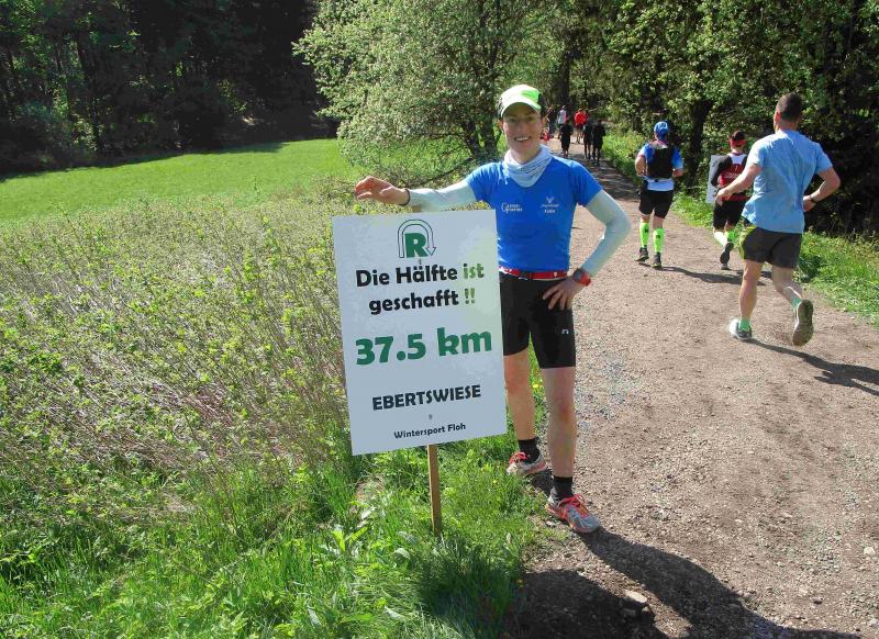 Mit "Hoher Schorn" auf 850 Metern war dann der dritthöchste Aussichtspunkt der Strecke erreicht. Schnell ein Foto mit Uwe vom Team Frankenwild, denn Uwe war an einem ganz anderen Punkt angekommen. Er wollte schlicht und ergreifend aufgeben, hatte genug gesehen vom Höhenweg des Thüringer Waldes, ihm tat einfach alles weh. Da hatte er aber die Rechnung ohne die Bode-Runners gemacht, die alles daran setzten, ihn wieder auf Trab zu bringen. Die Karawane zog weiter und euphorisch wurde das Kilometerschild „50“ gefeiert!
