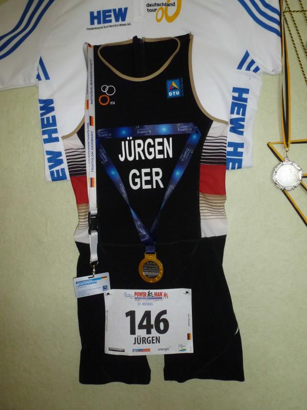 „Kniebrecher“, so der Name, über den ein Teil der Strecken im Saarland führte, sagt schon viel über das Profil des Duathlonwettkampfes aus. Zweimal 10km Laufen und dazwischen 60km Radfahren über einen anspruchsvollen Kurs mit Steigungen bis zu 13% ist schon Tortur. Als Mitglied der Nationalmannschaft bereitete er sich intensiv in einem Trainingslager in Südtirol auf die Europameisterschaft vor. So hatte Jürgen Eisfeld auch keine Probleme, die steilen Abfahrten mit Tempo 87km/h zu meistern. Die ersten 10km schaffte er in 1.06:22h, dann bewältigte er den Radkurs in 2:21.37h. Hierbei musste die Strecke dreimal durchfahren werden, ergo hieß es auch, die sich wiederholenden Steigungen immer wieder zu erklimmen. Auf der abschließenden Laufrunde zollte Eisfeld dem „Kniebrecher“ Tribut und verlor etliche Minuten am Anstieg. Die zweite Laufrunde beendete er in 1:18:02h. Angefeuert von seiner Frau Bärbel schaffte er es wieder glücklich ins Ziel.