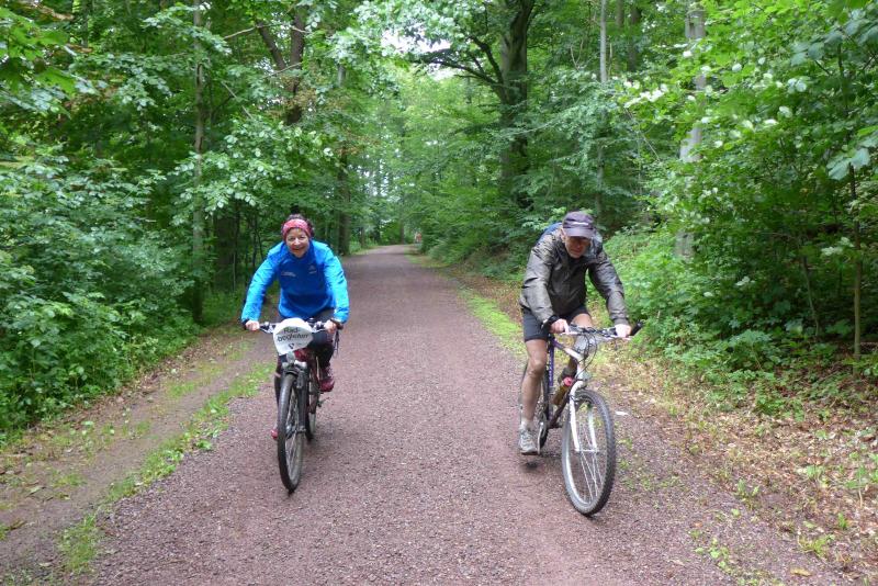 15:00 Uhr?: Walter erzählte von früher. Zusammen schob es sich leichter, denn es ging sofort wieder rauf zum Gänseberg. Auf den Abfahrten wurden Kilometer gut gemacht, aber Jens-Uwe war immer noch nicht zu sehen. Er wird die Berge laufen, ist sich Walter sicher, den würden wir nicht kriegen. Ein Zieleinlauf ohne Partner? Walter merkt schnell, dass Sabine Tempo machen will, für den erfahrenen Profi immer noch kein Problem. Ganz nebenbei lernte seine Weggefährtin das kleine 1x1 der Crossbiker.