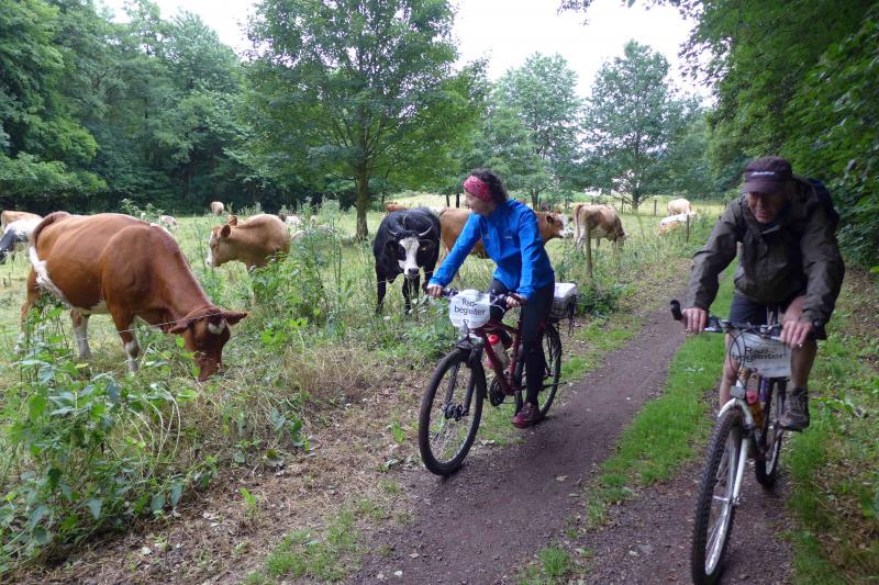 7:30 Uhr: Der Regen sollte erst um die Mittagszeit einsetzen, Petrus hatte aber einen anderen Plan. Schnell füllten sich die unbefestigten Wege mit großen Pfützen und Jens-Uwe hatte seine Mühe das Rad durch den Schlamm zu fahren. An der nächsten Steigung drehten die Räder schließlich durch und die erste Schiebung des Tages nahm ihren Lauf.