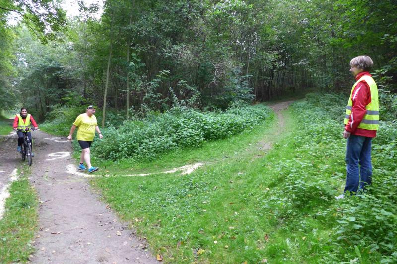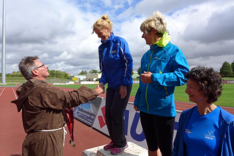 Spätestens am Treppenaufstieg über 63 Höhenmeter war der Genuss dann vorbei. Doch der Mönch belohnte die Anstrengungen mit reichlich kühlem Nass und anspornenden Worten, so dass nach kurzem Luftholen die Beine auch wieder laufen wollten. Bald war der höchste Streckenpunkt erreicht und es ging auf weichem Waldboden und auf reichlich Kienäpfeln wieder hinab. Jens-Uwe Börner, der verletzungsbedingt wandernd auf der Sechs-Kilometer-Distanz unterwegs war, freute sich, dass jeder Läufer der Langdistanz auf dem Weg zum Ziel an ihm vorbei musste. Die Actionfotos waren schnell im Kasten und einen aufmunternden Spruch gab es natürlich auch mit auf den Weg. Mit dem Schwung aus den Bergen ging es rasant in Richtung Stadion. Die Sprecherin war bereits zu hören und die letzten Meter auf der Tartanbahn waren viel zu schnell vorbei. Halberstadt, das war wieder wunderschön - ja schön war’s…