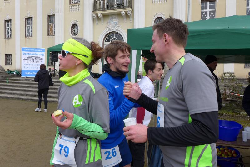 Seit geraumer Zeit kann man in den Medien die angedachte Sanierung des Tangerhütter Schlosses verfolgen. Bauabschnitt für Bauabschnitt geht es voran, so dass von dem aufzubringenden Eigenanteil von 60.000 Euro durch diverse Veranstaltungen und Spenden bereits 50.000 Euro gesammelt werden konnten. Unter dem Motto, „Die Tangerhütter haben einen Dachschaden“, wurde nun aktuell der Aufruf zu einem Spendenlauf gestartet. Während beim 15-minütigen Kinderlauf die 400 Meter-Runde mit einem Euro für die Aktion zu Buche schlug, waren für den 2,4-Kilometer-Kurs durch den Stadtpark ganze fünf Euro pro Runde fällig. Für zwei Stunden war der Parcours freigegeben, in denen jeder entsprechend seiner Fitness beziehungsweise seinem Geldbeutel auf die Rundenjagd ging. Gut beraten war, wer vor dem Lauf einen Sponsor für seine Runden fand. Aus den Reihen der Bode-Runners konnten sich vier Sportler für diese Aktion begeistern. Mit Stefan Otto und Jens-Uwe Börner hatten die Gaensefurther zwei Läufer am Start, die das Spendenkonto merklich füllen wollten. Weniger schnelle Akteure wie Hilde Gaede und Sabine Börner wanderten den Kurs, denn auch das war möglich und gewollt. Bewegung für einen guten Zweck, da war jedes Tempo herzlich willkommen. Otto, der mit dem Deutschen Marathon-Meister Frank Schauer einen optimalen Laufpartner gefunden hatte, spulte Runde für Runde ab. „So viel wollte ich vor dem Tel Aviv Marathon am nächsten Wochenende gar nicht laufen, aber die Stimmung war perfekt, das Tempo mit Frank optimal und es war ja für einen guten Zweck!“, so Otto nach dem Zwei-Stunden-Rennen, der wie Schauer mit 12 Runden am Ende fast 29 Kilometer in den Beinen hatte. Nach Adam Riese gingen damit 120 Euro in den großen Spendentopf und 250 Mitläufer füllten weiter kräftig auf. Mit den Einnahmen vom Kuchen-, Glühwein- und Grillstand kam die Summe an die 5.000 Euro heran. Die fehlenden Biberschwänze werden aber beim kommenden Benefizkonzert „Krach für`s Dach“ zusammenkommen, da sind sich die Organisatoren ganz sicher.