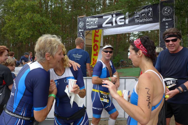 Mit der Wettkampfeinweisung stieg dann auch die Anspannung bei den Bode-Runners. Die meisten Jedermann-Veranstalter lassen ihre Teilnehmer 500 Meter schwimmen, doch in Wischer waren 750 Meter ausgeschrieben. Ein schlechtes Omen für die Gaensefurther Läufer, die allesamt hohen Respekt vor der Schwimmdisziplin haben und froh sind, wenn sie dem feuchten Element wieder entflohen sind. Einen Neoprenanzug benötigen die Bode-Runners im Übrigen nicht: „Meine Schutz- und Wärmeschicht ist echt!“, stellte Jens-Uwe Börner schmunzelnd fest! Los ging es und tatsächlich, was für ein „Staub“ am Wendepunkt der 750 Meter langen See-Runde! Triathlet André Geist wurde als Erster im Wechselgarten gesehen. Er gesellte sich nämlich kurzentschlossen zu den Jedermännern, verlief sein Drei-Kilometer-Testlauf am frühen Morgen doch besser als gedacht. Mit „Gute Fahrt“ verabschiedete das Schild eines bekannten Likörherstellers die Hobbysportler auf die 14,5 Kilometer kurze Radstrecke. Ruckzuck war die Runde von Wischer über Billberge, Storkau, Staffelde und Arnim gefahren, bevor die Runners endlich ihre Fünf-Kilometer-Distanz laufen konnten. Zufrieden klatschten die Sportfreunde ab. Mal was anderes als nur zu laufen! Gleich am folgenden Wochenende besteht in Havelberg die nächste Möglichkeit für einen Triathlon. Dort endet auch die altmark3cup Wertung, in der die Platzierten von Arendsee, Wischer und Havelberg in die Endauswertung gehen. Mit Renate Liedtke, Kirsten Geist sowie Jens-Uwe und Sabine Börner sind die Bode-Runners gut aufgestellt, bevor dann am 27. Juli alle Augen auf dem vereinsinternen 4. Salzlandsparkassen-Triathlon liegen.