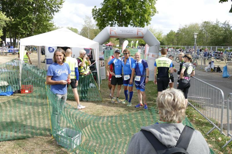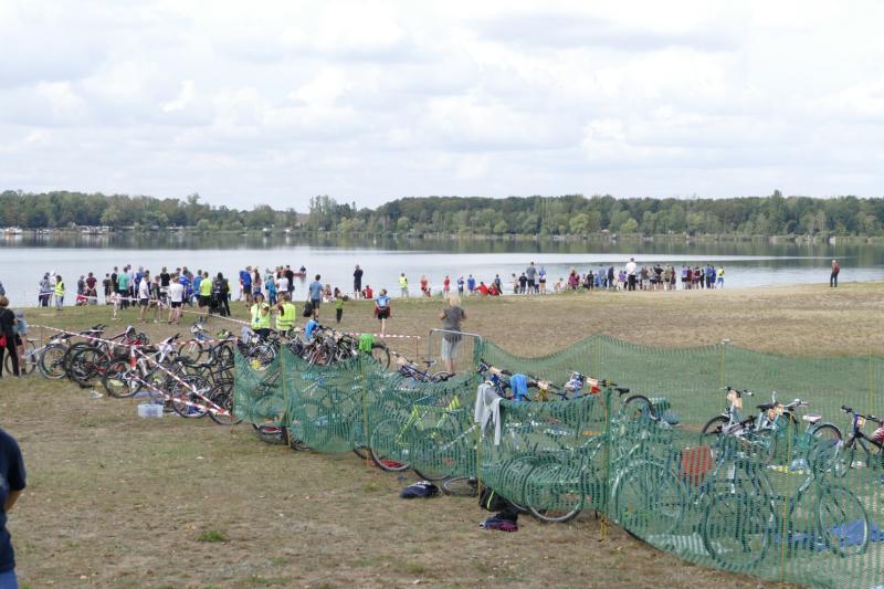Fast 150 Teams gingen an den Start bei tollem Wetter und recht warmen Wassertemperaturen. Nach einem holprigen Sprintstart im Sand des Barleber Sees ging es ans Hauen und Stechen über die 750m Schwimmen. Die Staffelstarter müssen schon ein ordentlich dickes Fell haben und keine Angst vor derben Stößen durch die Beine und Arme der Konkurrenz. Nach Runde eins wurde der Transponder an den nächsten Starter übergeben und dann an Nummer drei. Das gleiche Prozedere vollzog sich dann auch über die 21km Radfahren und letztendlich bei den drei Laufrunden von je 4,7km um den Barleber See. Wenn alles klappte, konnte man dann mit dem Schlussläufer als Team durch das Ziel laufen und seine Leistung gemeinsam feiern. Bei den Gaensefurther Triathleten lockten unter anderem schon Himbeertiramisu, Erdbeertorte und leckere Wraps im Teamzelt.