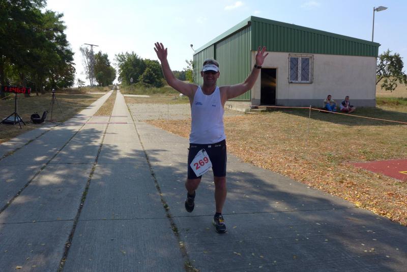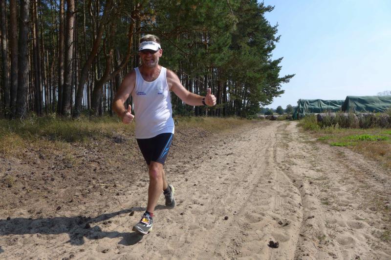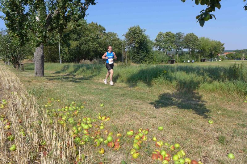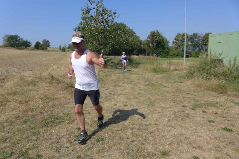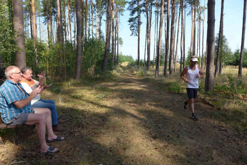 Was den Untergrund betraf, hatte die Strecke alles zu bieten und verdiente zweifelsohne das Prädikat „Cross“. Betonplatten führten über die erste Anhöhe, bevor eine Gabelung die Kurzstrecke über drei Kilometer bald von der Sechs-Kilometer-Distanz trennte. Auf weichen Waldwegen musste man lediglich den zahlreichen Kienäpfeln ausweichen. Ganz nach dem Geschmack für Barfußläufer, wechselten sich holprige Stoppelwiesen mit tiefen Sandwegen ab, bevor auch schon wieder eine weitere Anhöhe zu erklimmen war. Ehe es aus dem Wald hinaus auf eine Lichtung ging, versorgte ein Verpflegungsstand mit Getränken. Der Hinweis, die leeren Becher wieder in die bereitgestellten Abfallbehälter zu werfen, brachte manchen Läufer aus dem Tritt, denn oft verfehlte die Arm-Motorik das enge Ziel. Das muss vor den nächsten Wettkämpfen unbedingt geübt und weiter verinnerlicht werden! Die große Lichtung erlaubte eine Ausschau auf das Renngeschehen, machte Abstände sichtbar und offerierte eine weitere Anhöhe, die zu bewältigen war. Aber es ging dann auch mal bergab, bevor ein Streckenposten bei Kilometer 5,3 die letzte Steigung ankündigte. Die geschafft, ging es für alle Sechs-Kilometer-Läufer rasant bergab in das wohlverdiente Ziel.