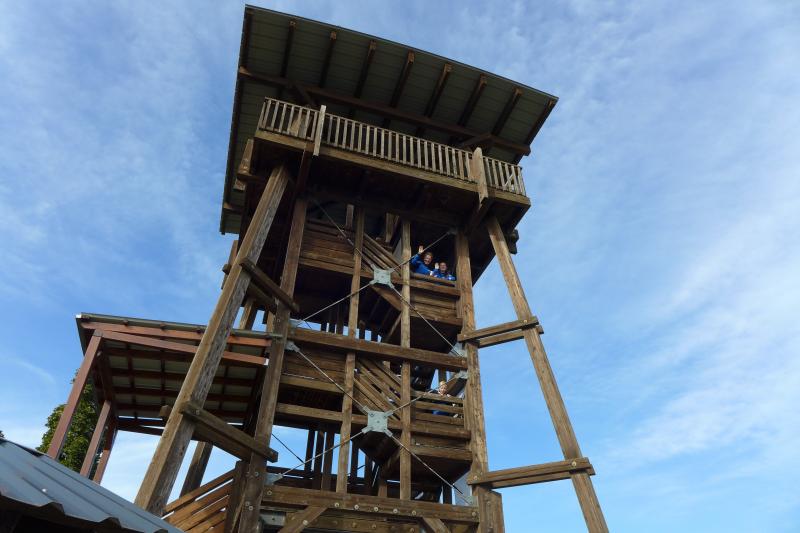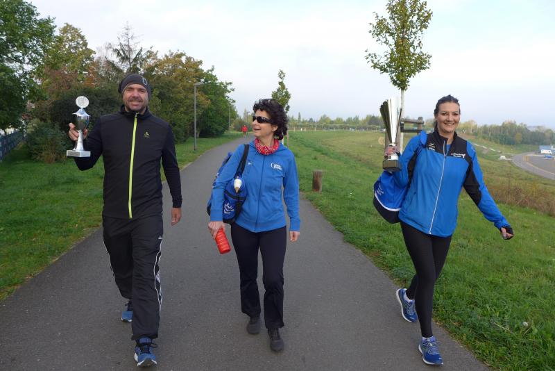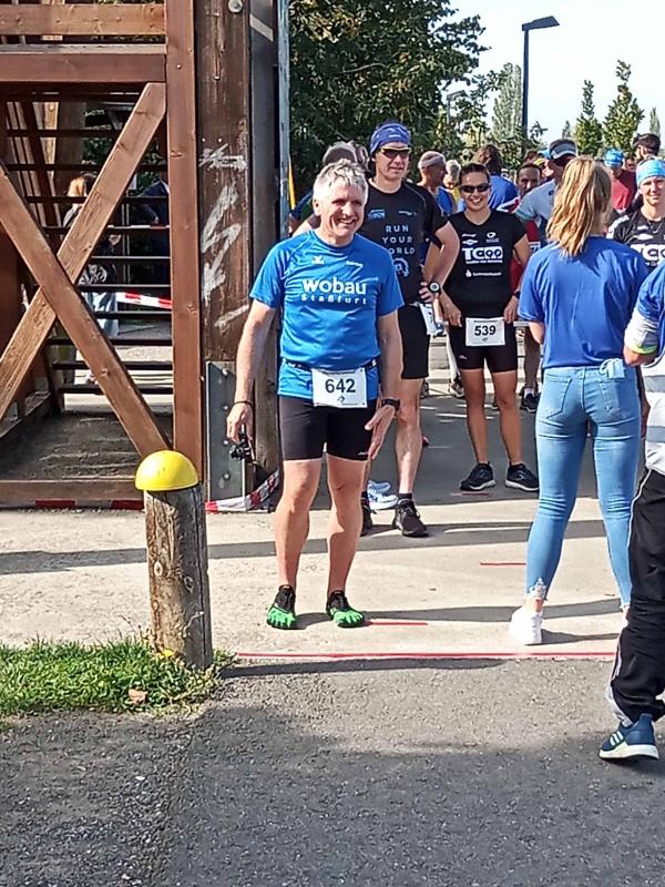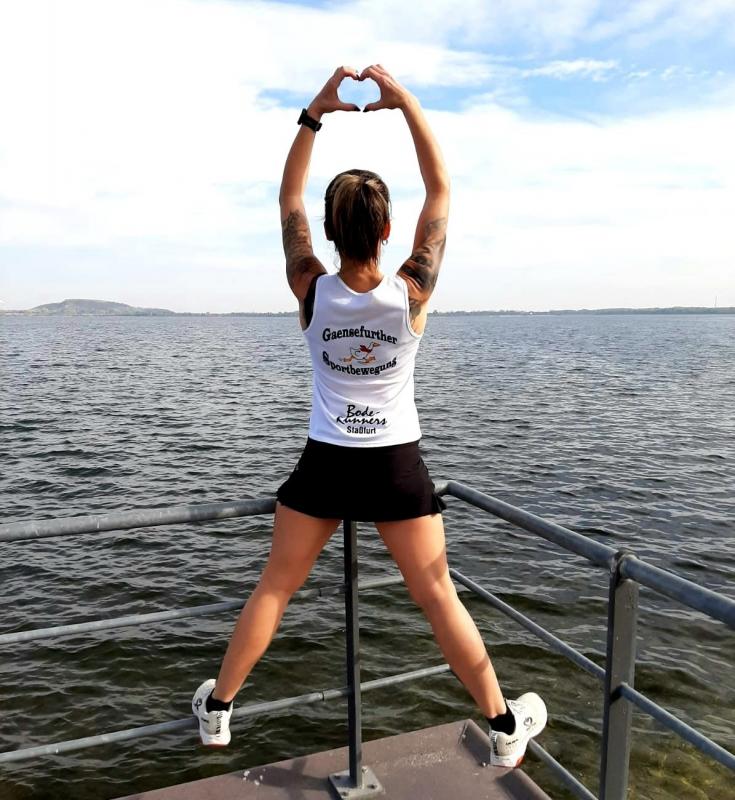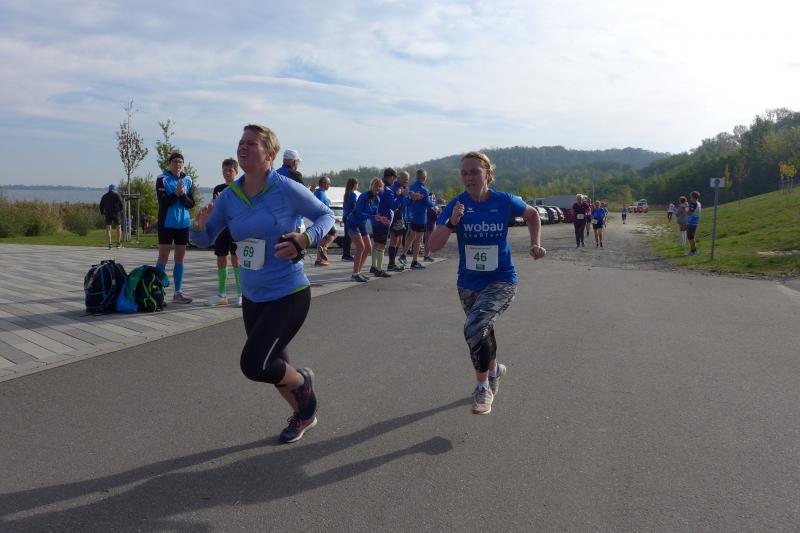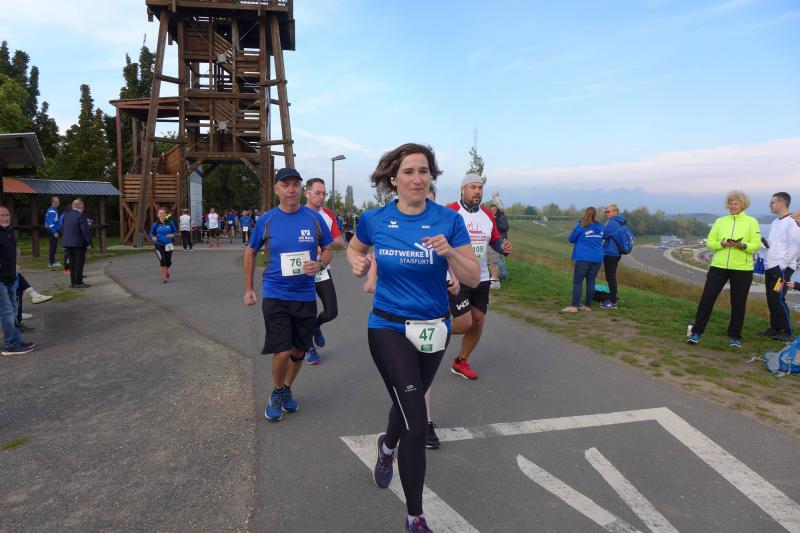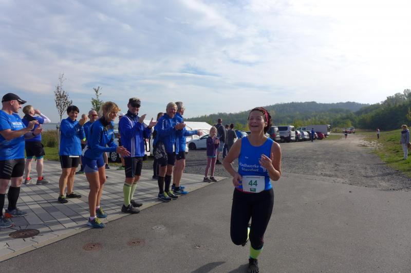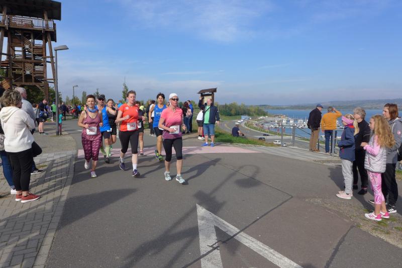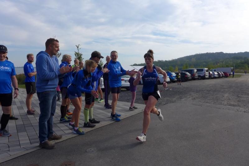 Vom Aussichtsturm „Leonhardt“ gingen jeweils zehn Starter im Minutentakt auf die Reise. Elf Gaensefurther waren auf der Kurzstrecke mit dabei. Da hatten es die Fahrgäste im Geiseltal-Express doch etwas bequemer. Unbeeindruckt und manchmal gefährlich nahe, zog die bunte Kleinwegebahn an den Läufern vorbei. In leichten Wellen ging es auf dem Geiseltalrundweg entlang, bevor die letzten drei Kilometer direkt am See zurückführten. Nach dem großen Zielbogen am Besucherzentrum Marina wurden alle Finisher herzlich begrüßt. Zehn Sekunden schneller als im vorigen Jahr, fuhr Sandra Homann (1. Platz Altersklasse W40) im vereinsinternen Duell den Sieg für sich ein, gefolgt von Jana Berger (1. Platz W50) und Janine Wuwer (3. Platz W35).